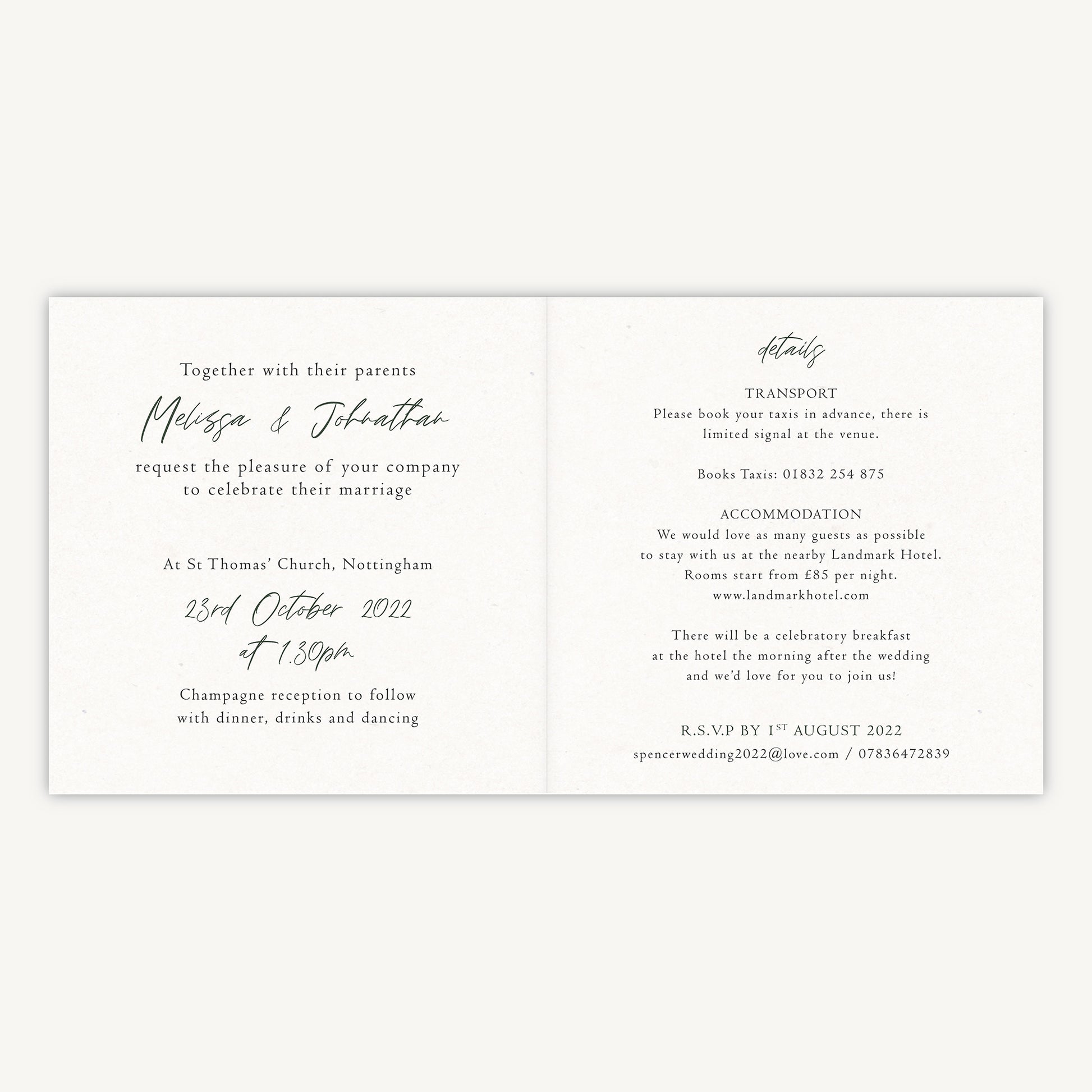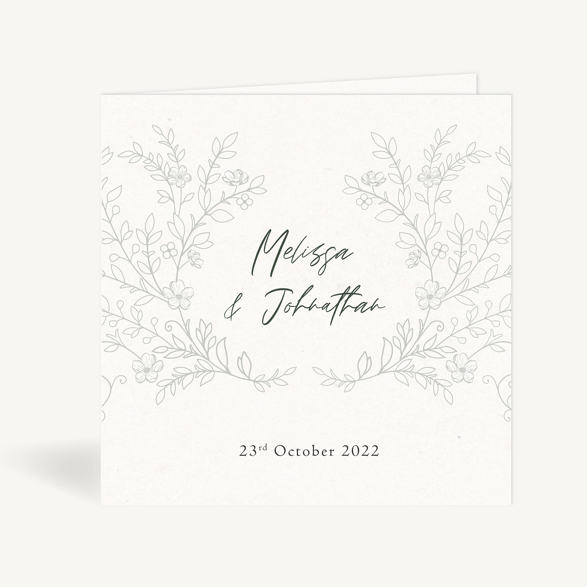 Our Elegant Floral Folded Wedding Invitation makes a lovely introduction to your wedding day. The delicate illustration combines a variety of curving leafy tendrils, buds, and blossoming flowers. Starting with a beautiful design and names on the cover, there is space for all the essential information inside and the adjacent page is perfect for informing guests of the finer points and RSVP details.