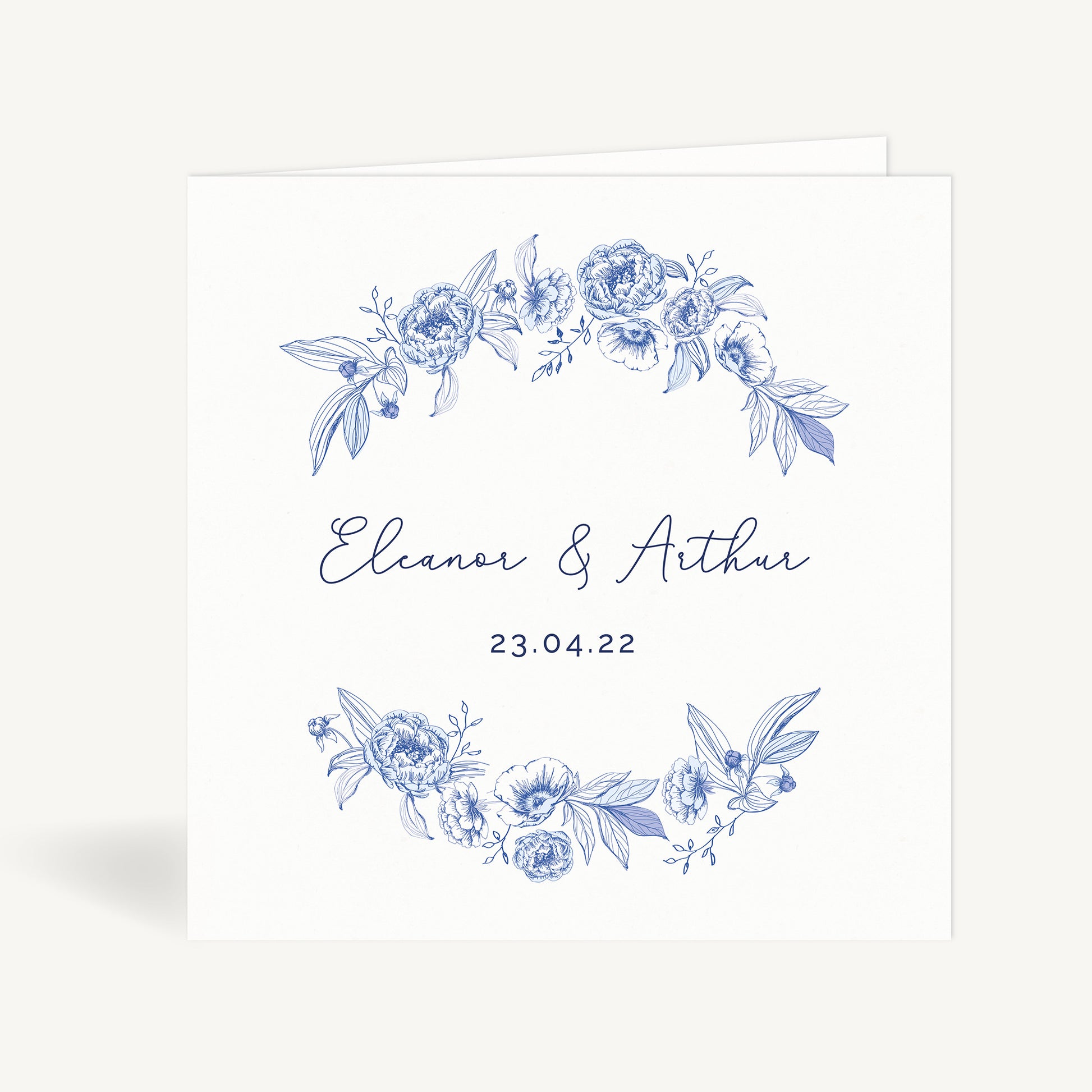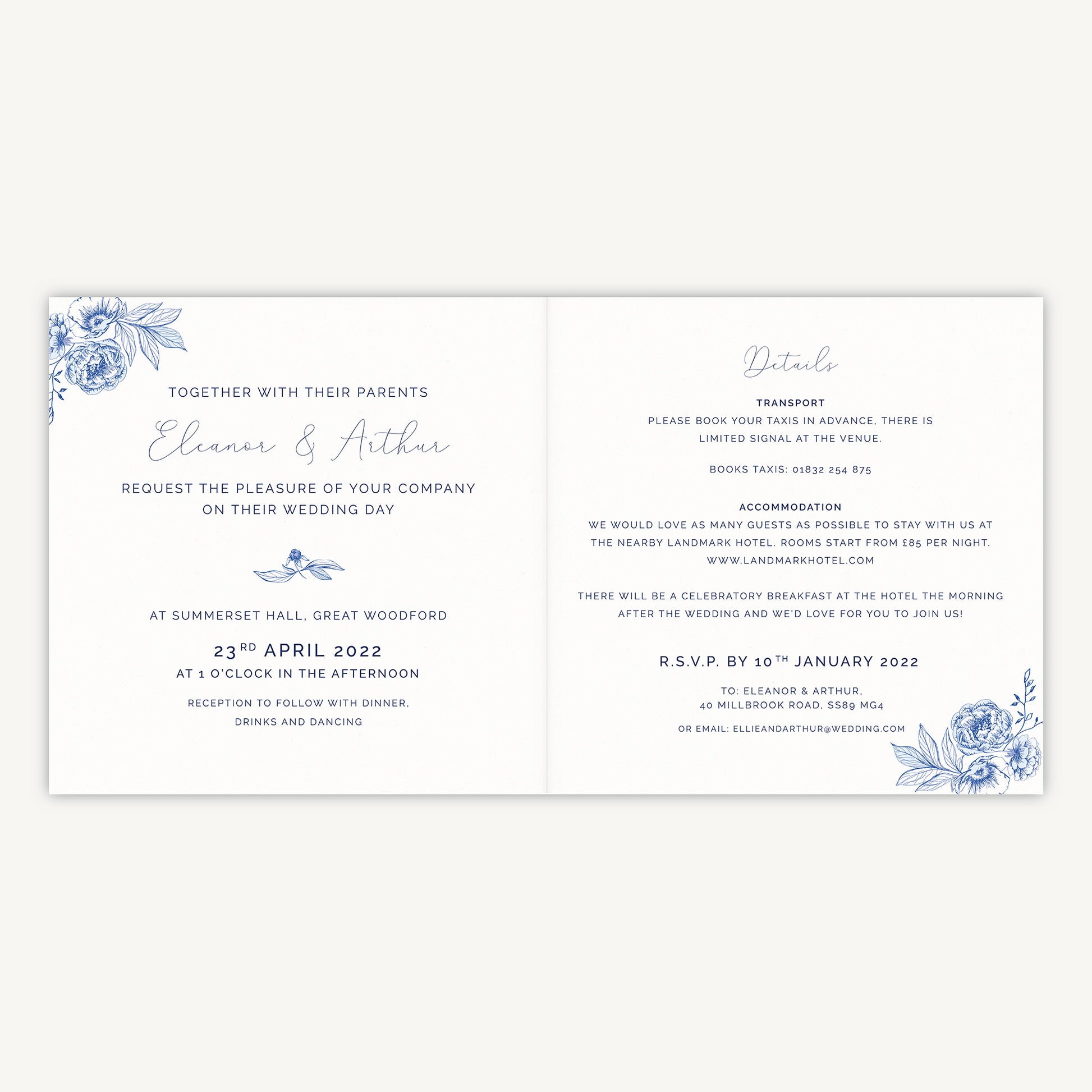 Our Farmhouse Blue Folded Wedding Invitation is a sophisticated way to welcome your loved ones into your special day. The rustic monochrome illustration of blossoming flowers is used to form wreaths and adorn corners throughout the stationery. Establishing the style of your upcoming wedding on the front cover, the inside invites the guests to your ceremony on one side and allows for further guest information to be shared on the other.