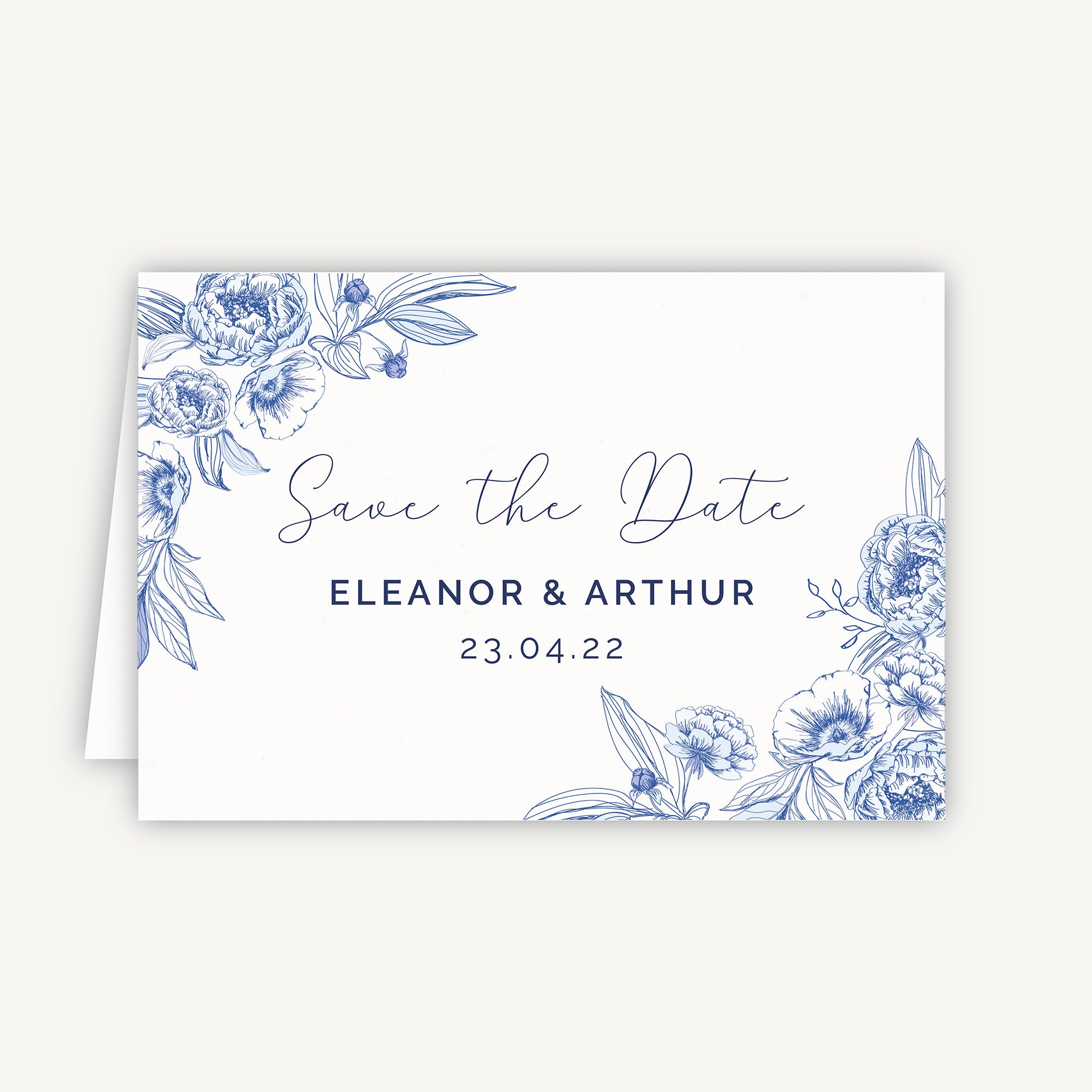 A classic way to let your guests know the wedding date with our Farmhouse Blue Folded Wedding Save the Date. The rustic monochrome illustration of blossoming flowers is used to form wreaths and adorn corners throughout the stationery. Highlight the important day with this calendar feature, which is revealed on the open fold, a style that can be convenient for wedding goers to pin up.