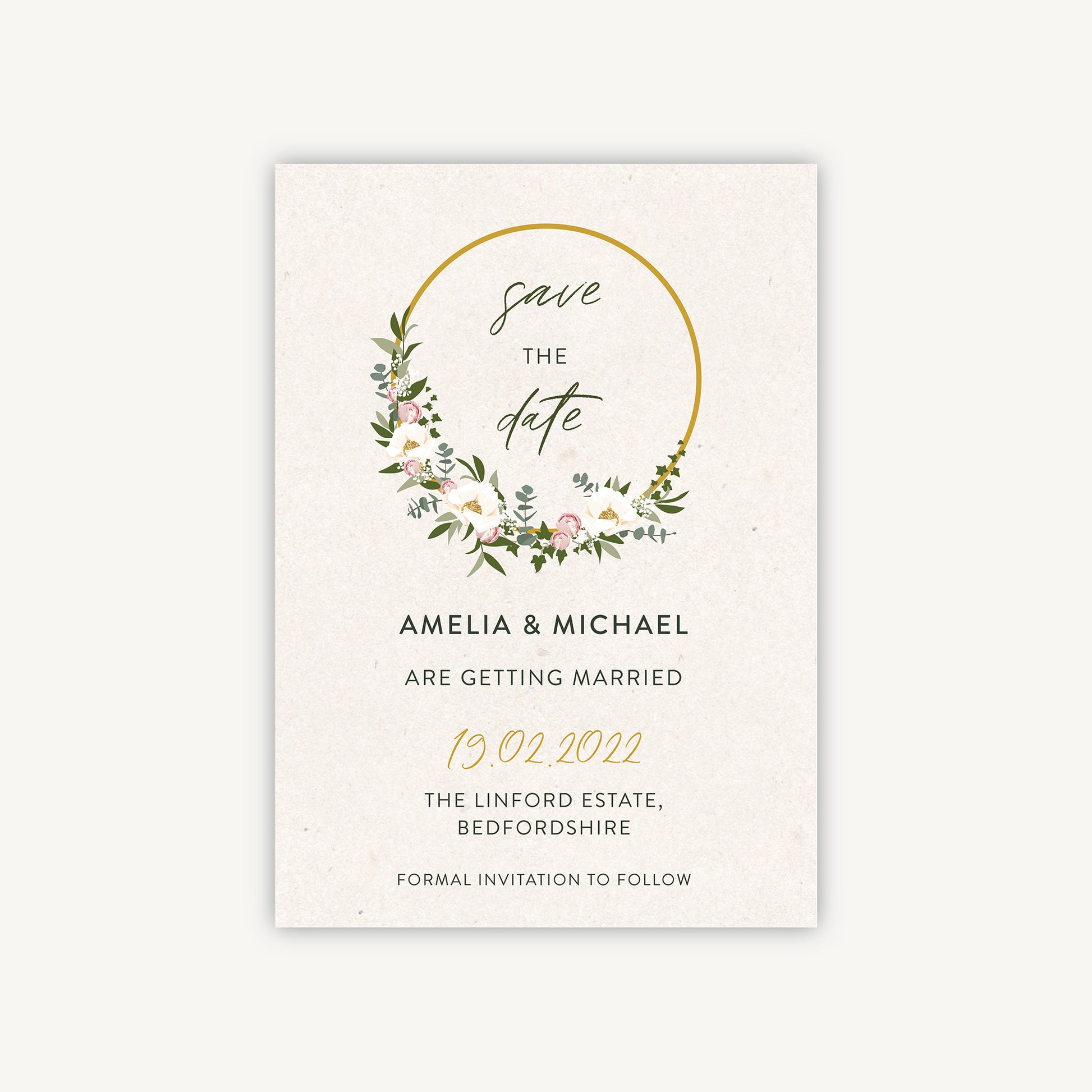 An elegant way to display your love with our Floral Hoop Wedding Save the Date. The lovely floral elements of the illustration are shown in varying layouts throughout the collection. You can add your names and wedding details below the floral hoop.