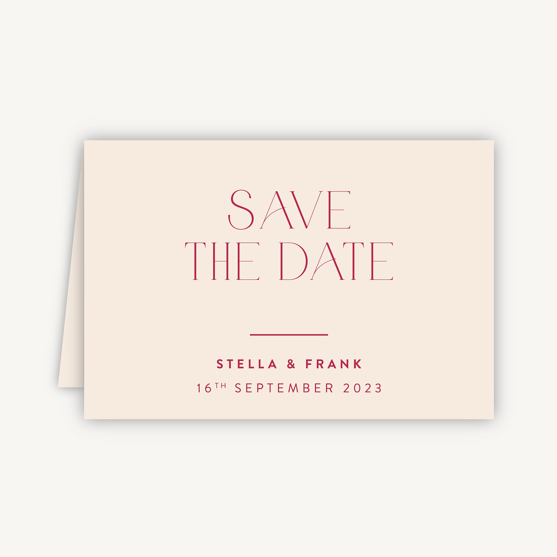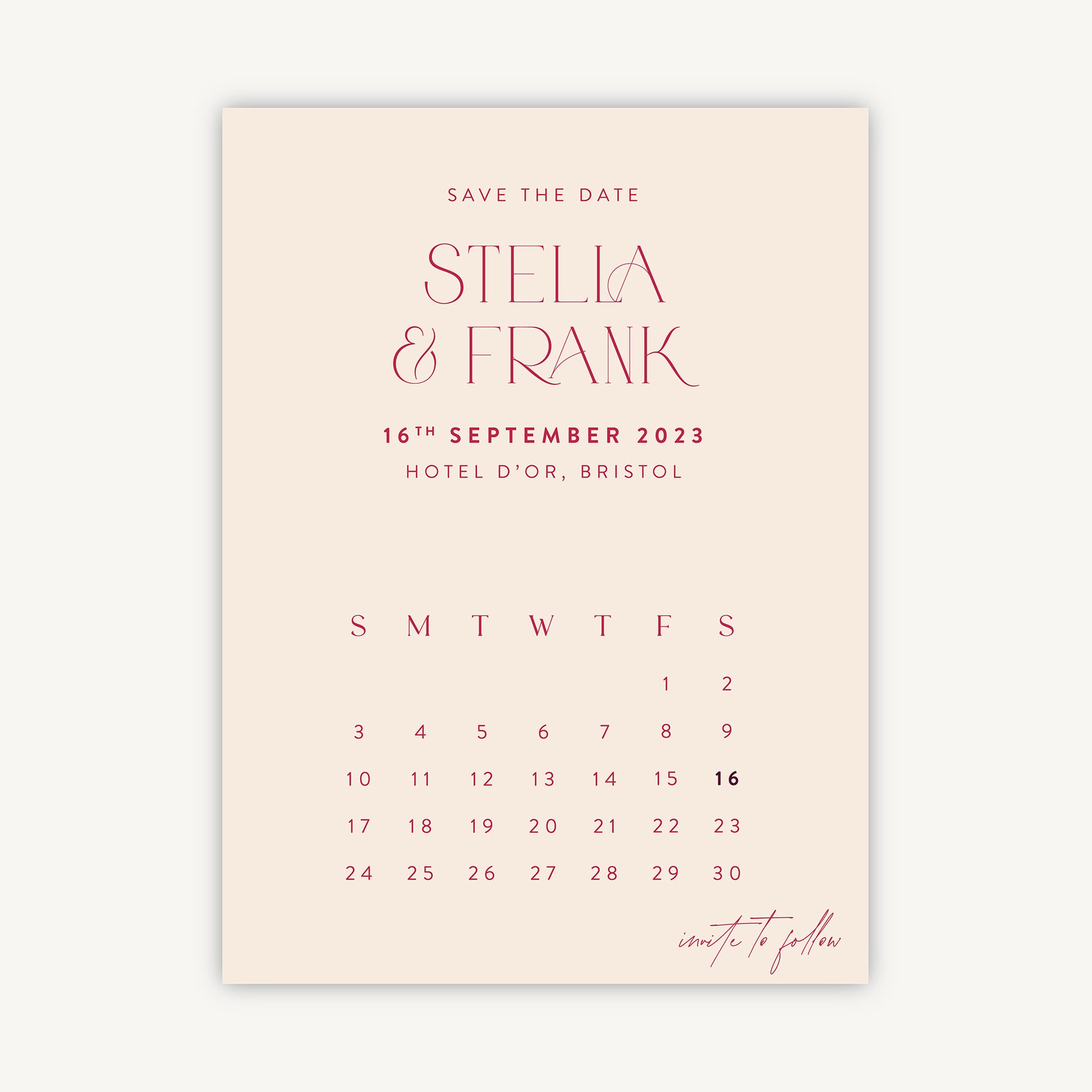 Surprise your guests with our Magenta Modern Script Wedding Save the Date. The sleek centralised layout allows the beautiful block colours to take precedence. This tactile style allows your guests to interact with your arrangements, the folded element reveals a beautiful calendar with your wedding date on display.