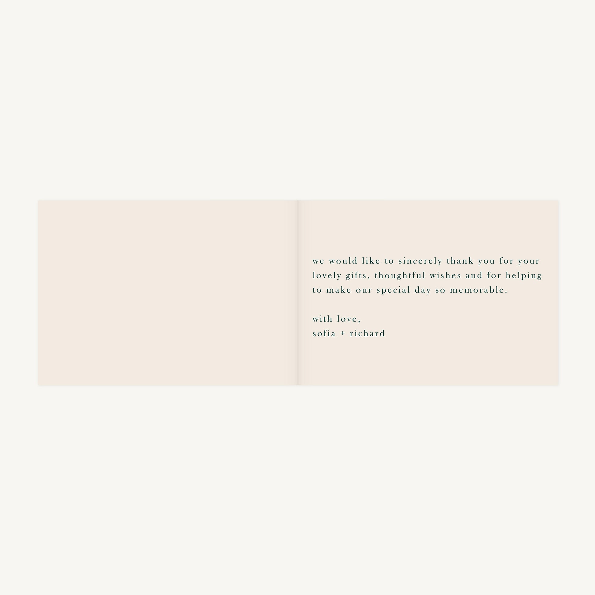 Folded wedding thank you card with printing on all sides and matching blank envelope
