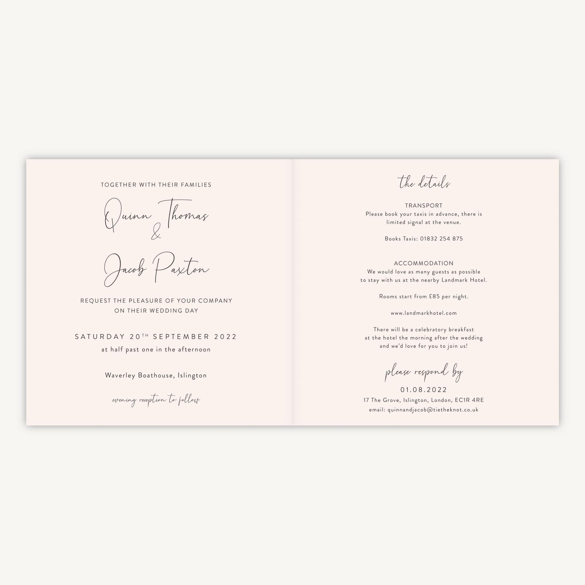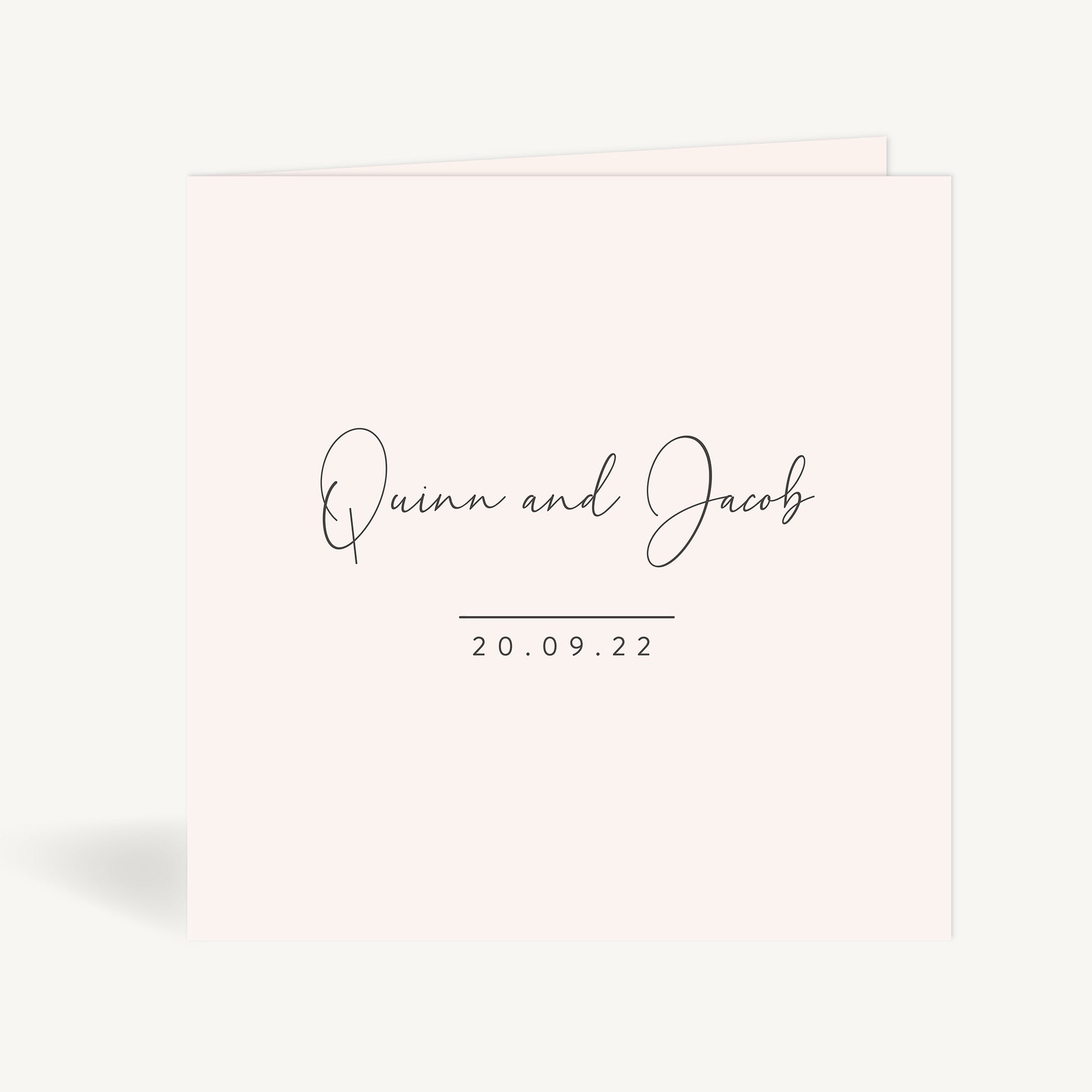Welcome your guests in style with our charming Romantic Script Folded Wedding Invitation. The main features of script and simple linework are shown in varying compositions throughout the collection. The cover introduces the theme of your upcoming wedding and inside addresses your loved ones with the details of the day, plus there is space for additional guest information and RSVP terms on the neighboring page.