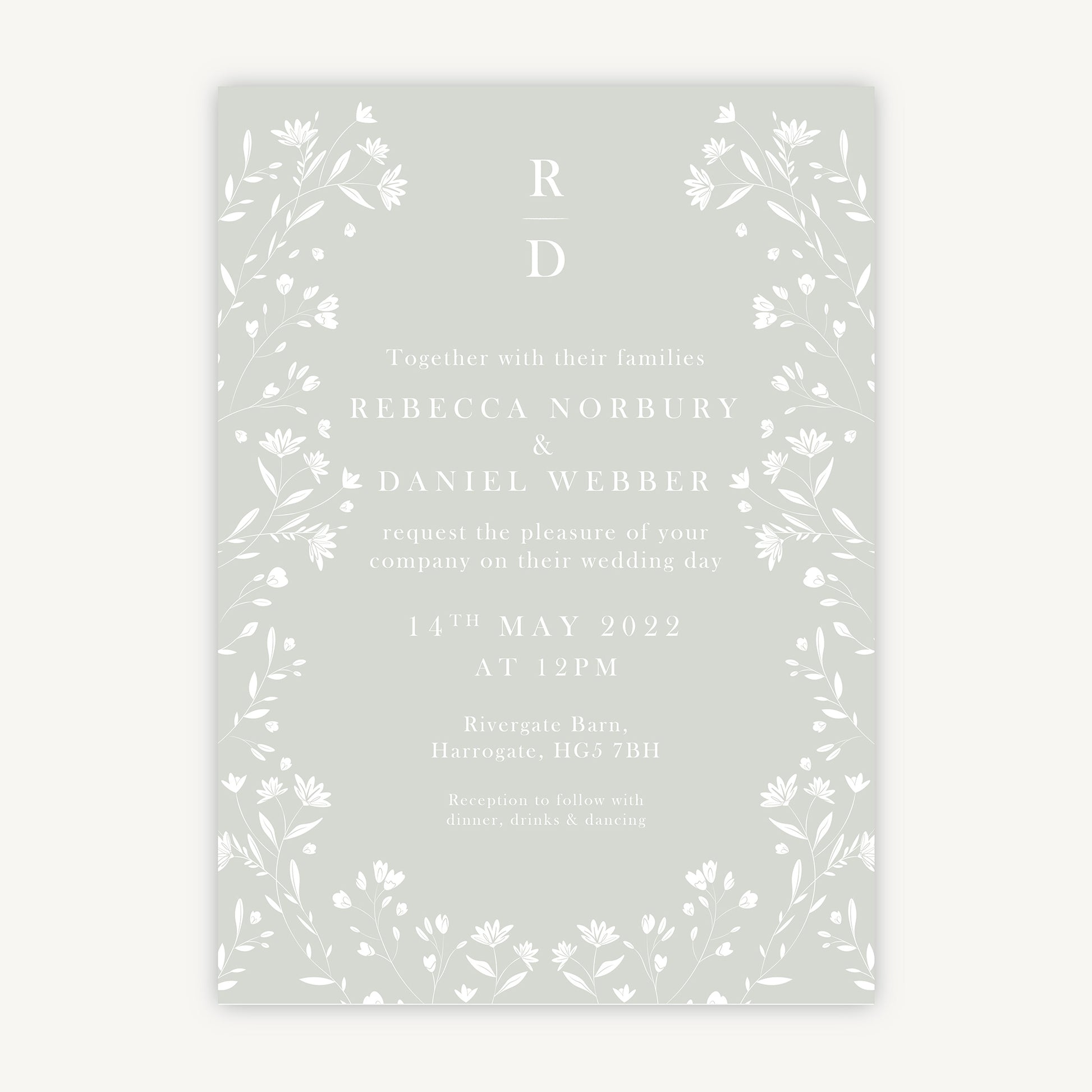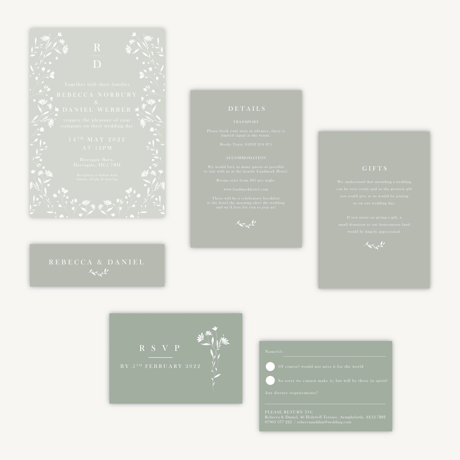 Our delicate Sage Wildflower Wedding Invitation is a lovely way to welcome your loved ones into your special day. This ethereal collection consists of a muted sage background adorned with delicate white wildflower illustrations. All the essential information is printed on the invite which can be embellished with a wrap-around band, RSVP card and an additional card for finer details if needed.