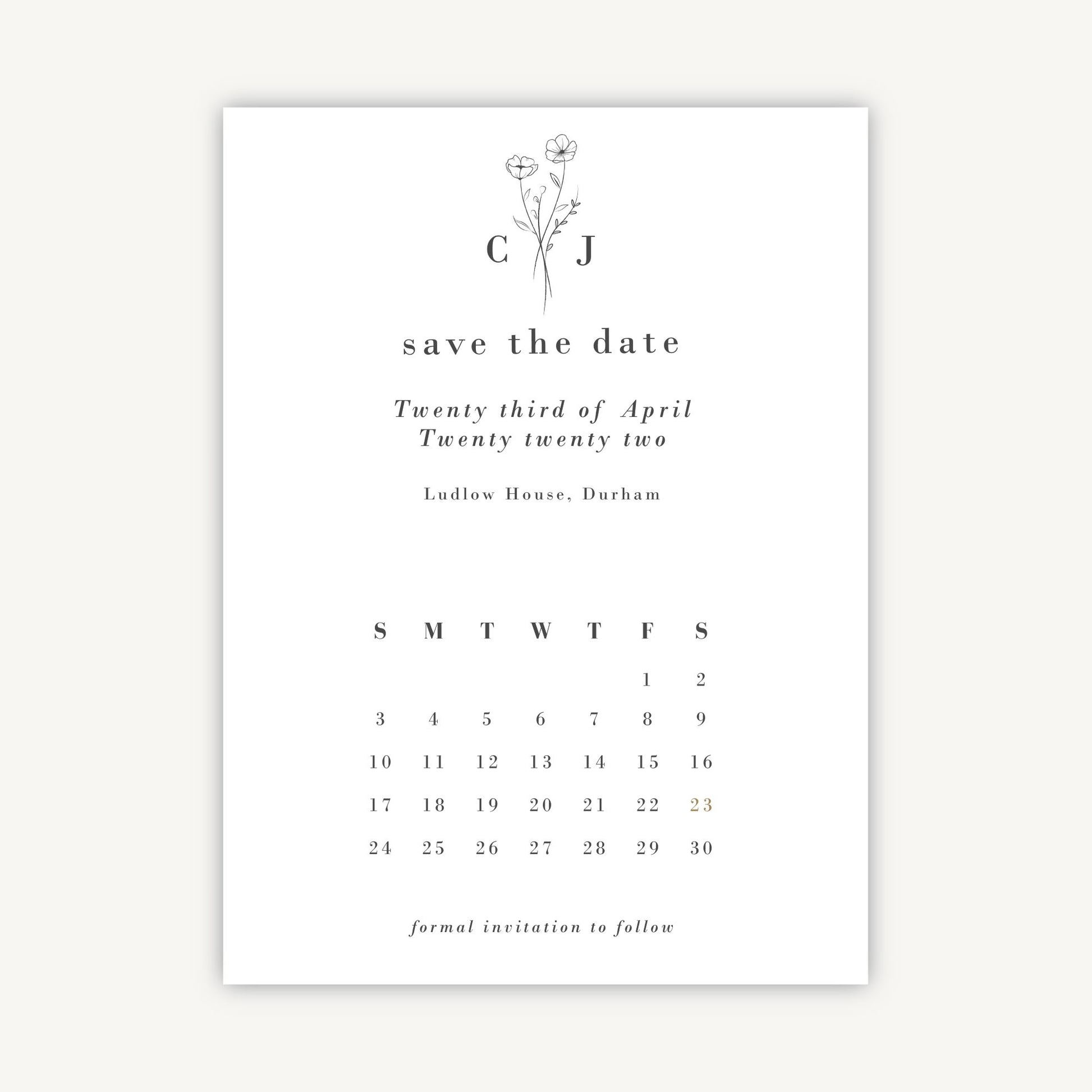 Announce your wedding date with our Simple Floral Folded Wedding Save the Date, it's a special blend of artistry and elegance. Stylised floral arrangements with twirling leaves and intertwining stems are set in the upper left corner, contrasting with the right-aligned text. Remind your guests of your special day with this modern calendar feature which is revealed once the card is on the open fold, together with all the wedding information that is needed.