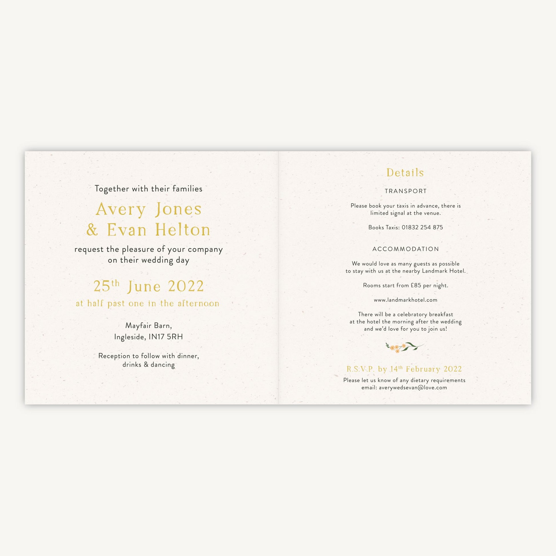 Announce all the official details with our charming Summer Meadow Folded Wedding Invitation. The floral illustrations explore delicate tones of peach, blush, and pale blue amongst the tendrils of greenery. Establishing the style of your upcoming wedding on the front cover, the inside invites the guests to your ceremony on one side and allows for further guest information to be shared on the other.