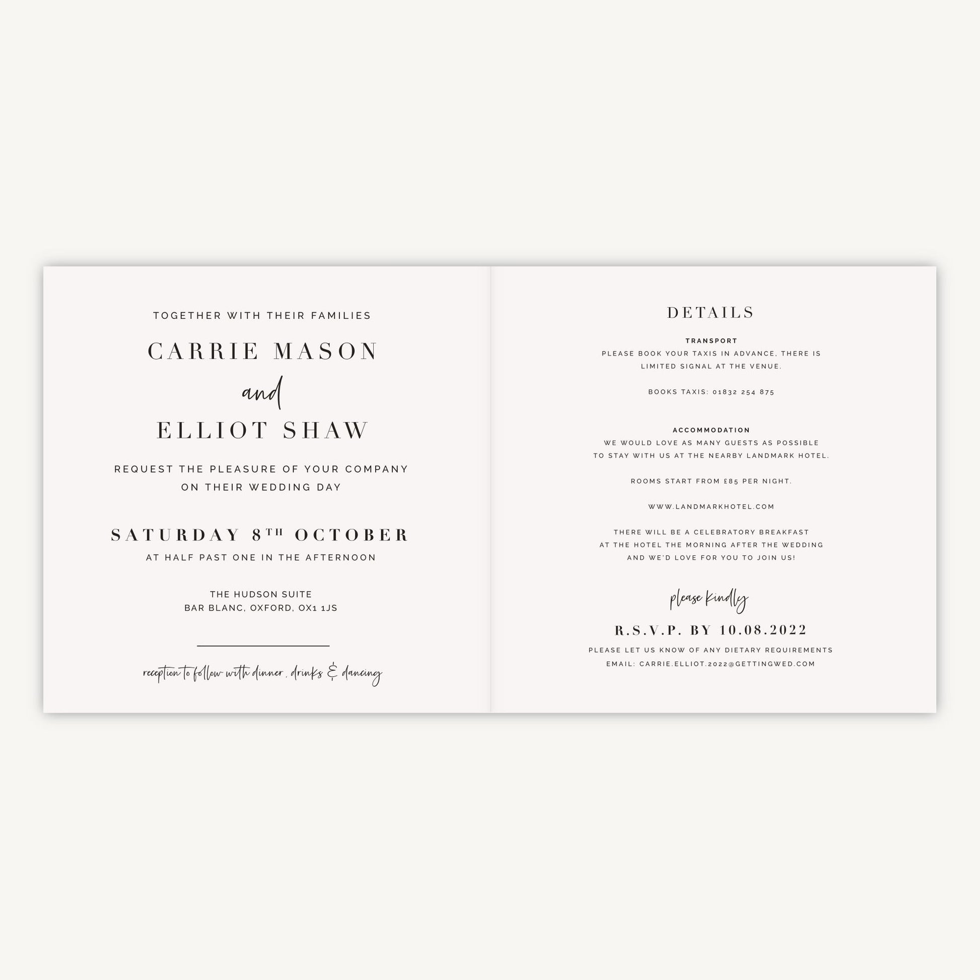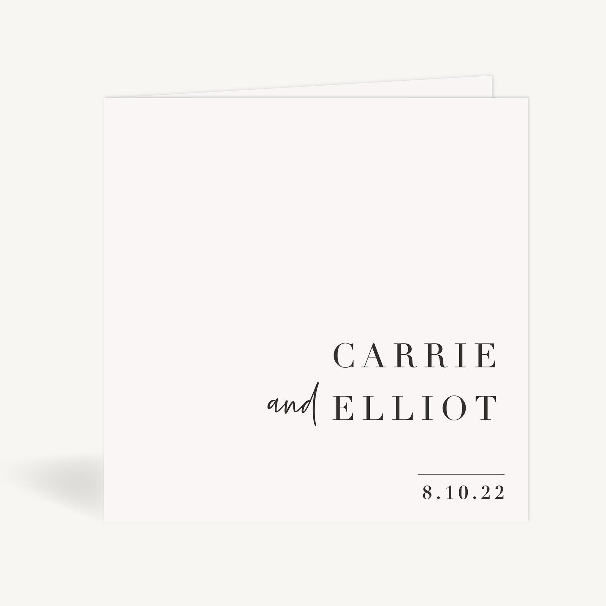 Our White Modern Script Folded Wedding Invitation is a sophisticated way to welcome your loved ones into your special day. Experimental use of space, line, and type orientation create heightened visual interest within this design. The cover introduces the theme of your upcoming wedding and inside addresses your loved ones with the details of the day, plus there is space for additional guest information and RSVP terms on the neighbouring page.