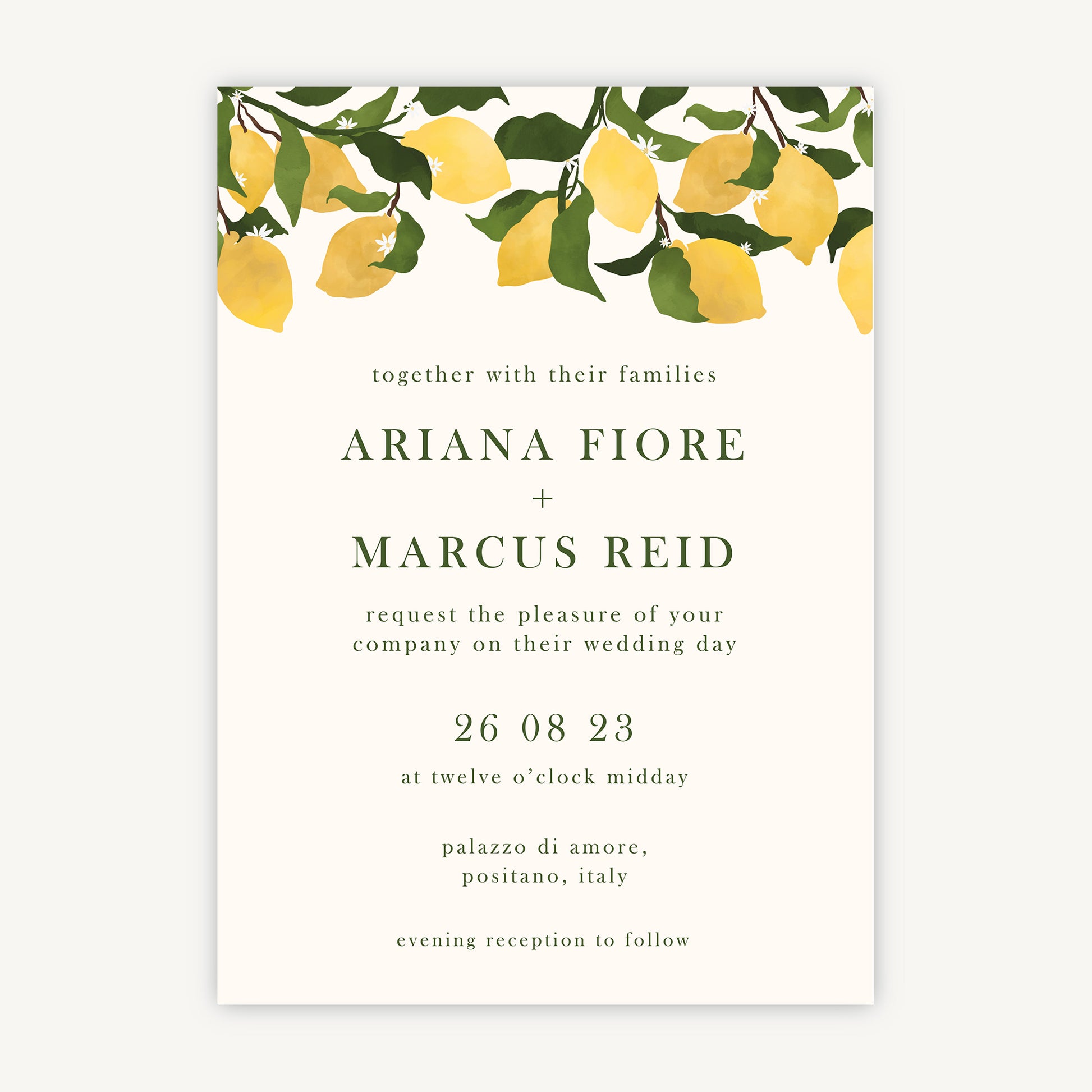 Announce all the official details with our elegant Amalfi Lemons Wedding Invitation. This luscious design features a subtle cream background with beautiful illustrations of zesty lemons and textured greenery. There is space for all the important details on the main card with optional extras such as RSVP card and band wrap to create a unique wedding invite.