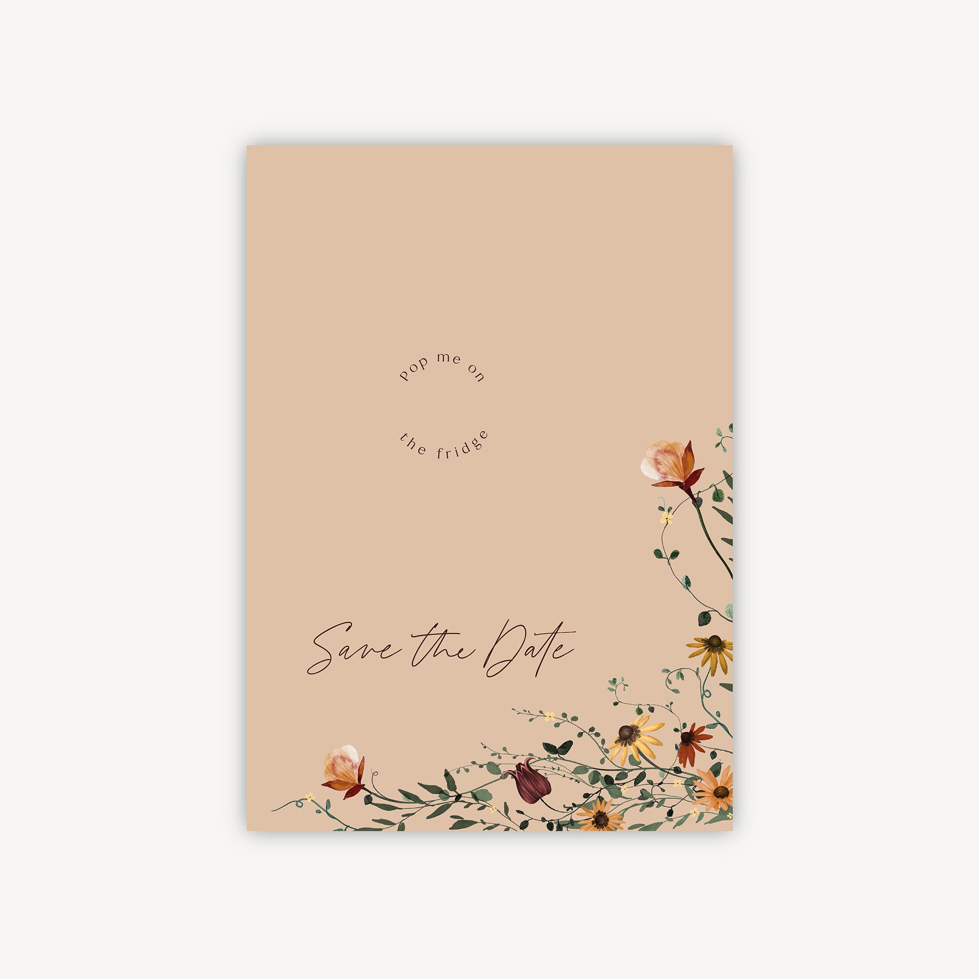 Set the tone for your upcoming wedding with our beautiful Autumn Wildflowers Wooden Magnet Wedding Save the Date. This stunning design features an entangled growth of autumnal wildflowers on a warm beige background. The stylish wooden magnet engraved with your names, wedding date, and venue can be easily removed from the sleek backing card and placed on the fridge by your invitees.