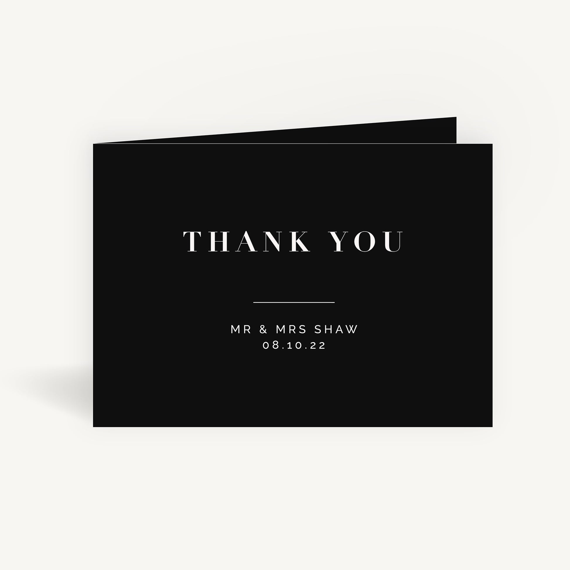 For presents or presence, our Black Modern Script Wedding Thank You Card Folded is a charming way to send thanks. The core typographic features and linework of this composition are explored in varying layouts across the collection. The delicate folded card sends thanks above your newly wedded names and date on the front and inside there is space for your heartfelt message of gratitude.