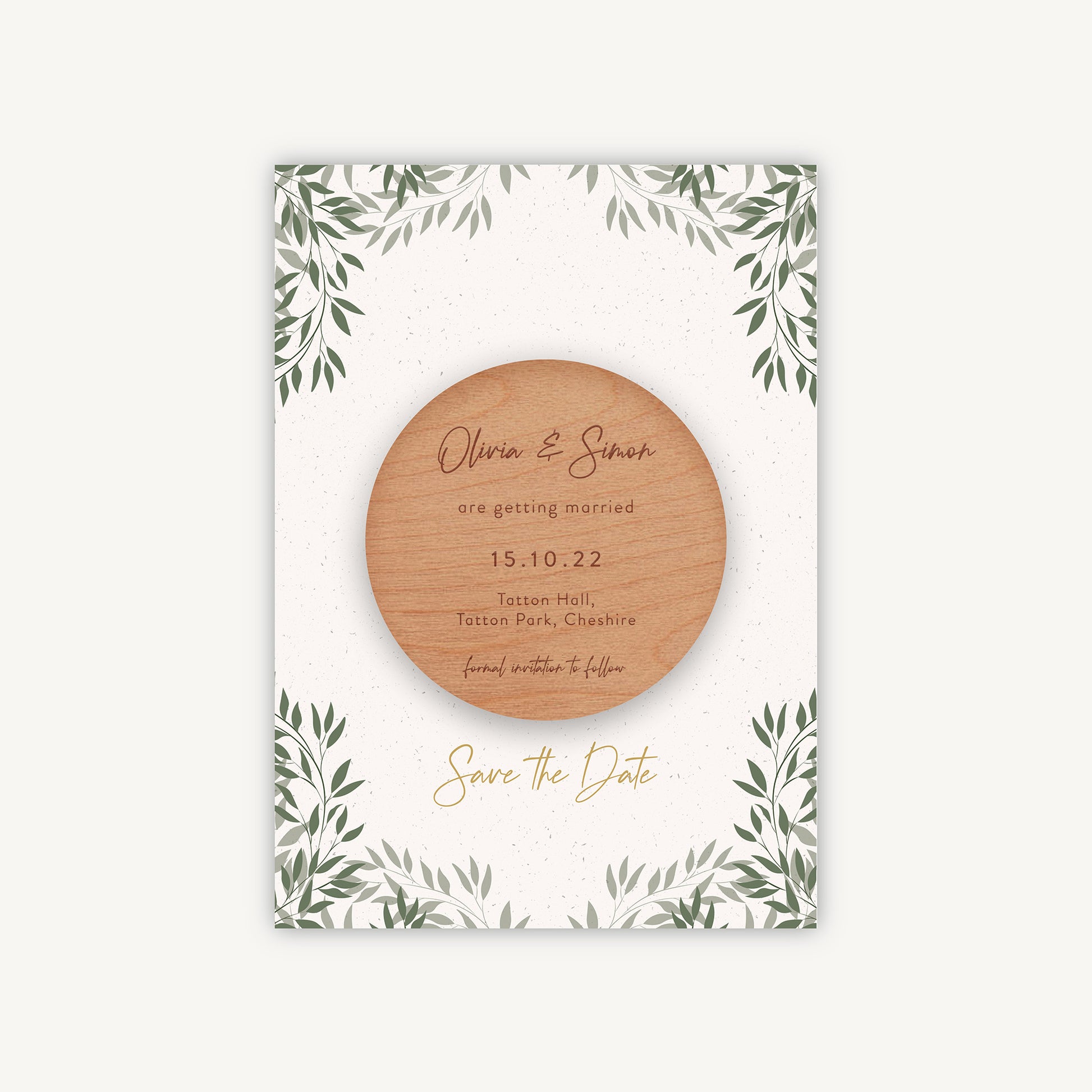 Take the first step of announcing your wedding with our Botanical Rustic Wooden Magnet Save the Date. The illustration comprises a set of sage green and deeper green leaves, adding depth to the wreath arrangement. The personalised names of the couple, their wedding date, and venue are intricately engraved onto a charming wooden magnet that sits atop a smooth backing card.