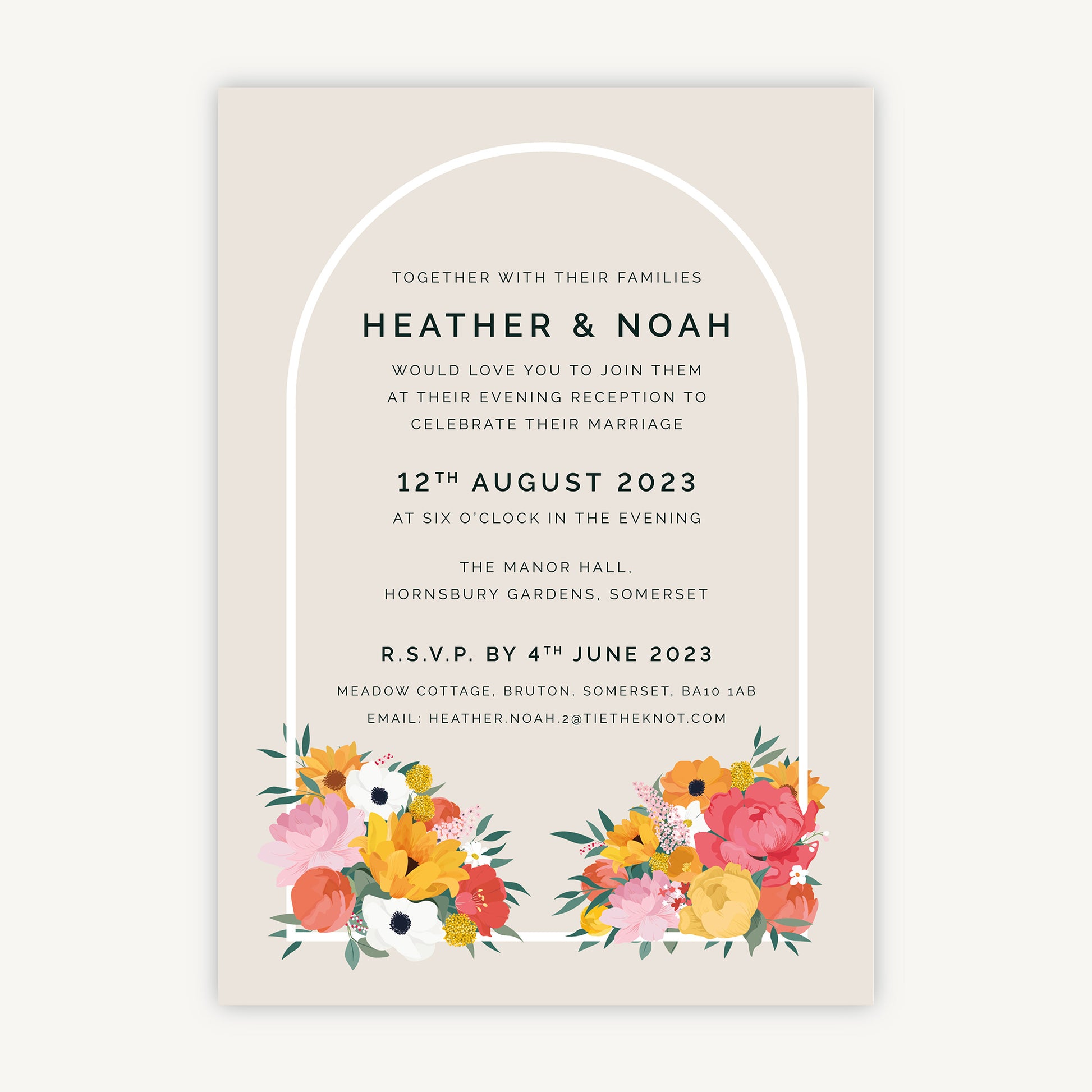 Our Bright Flowers Evening Wedding Invitation is a sophisticated way to welcome your loved ones into your special day. The illustration displays an array of gorgeous bold florals and striking white borders in varying compositions across the collection. There is space for a warm welcoming message alongside venue information, important times, and RSVP terms on this timeless curated card.