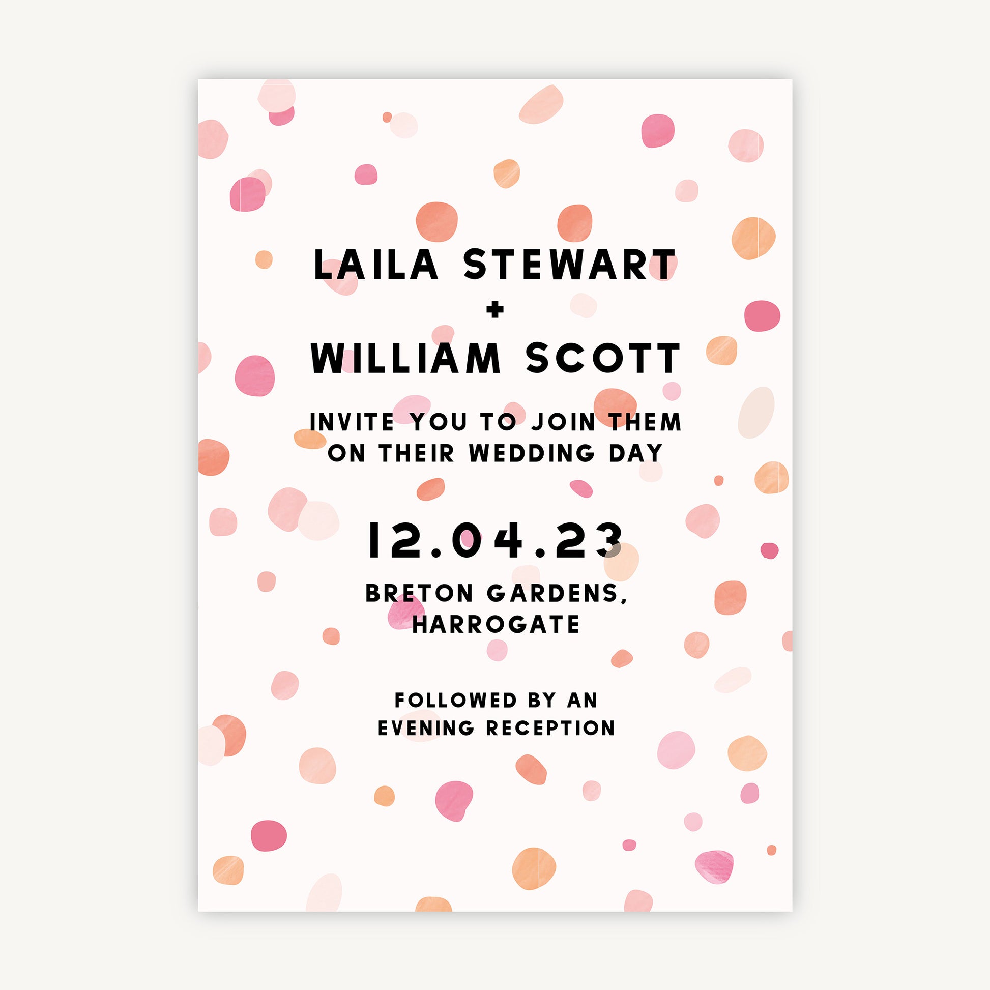 Our Bright Pink Confetti Wedding Invitation makes a lovely introduction to your wedding day. This cute design features a sprinkling of painterly pink confetti on a subtle peach background. There’s space for all the important details on the main card with optional extras such as RSVP card and band wrap to create a unique wedding invite.