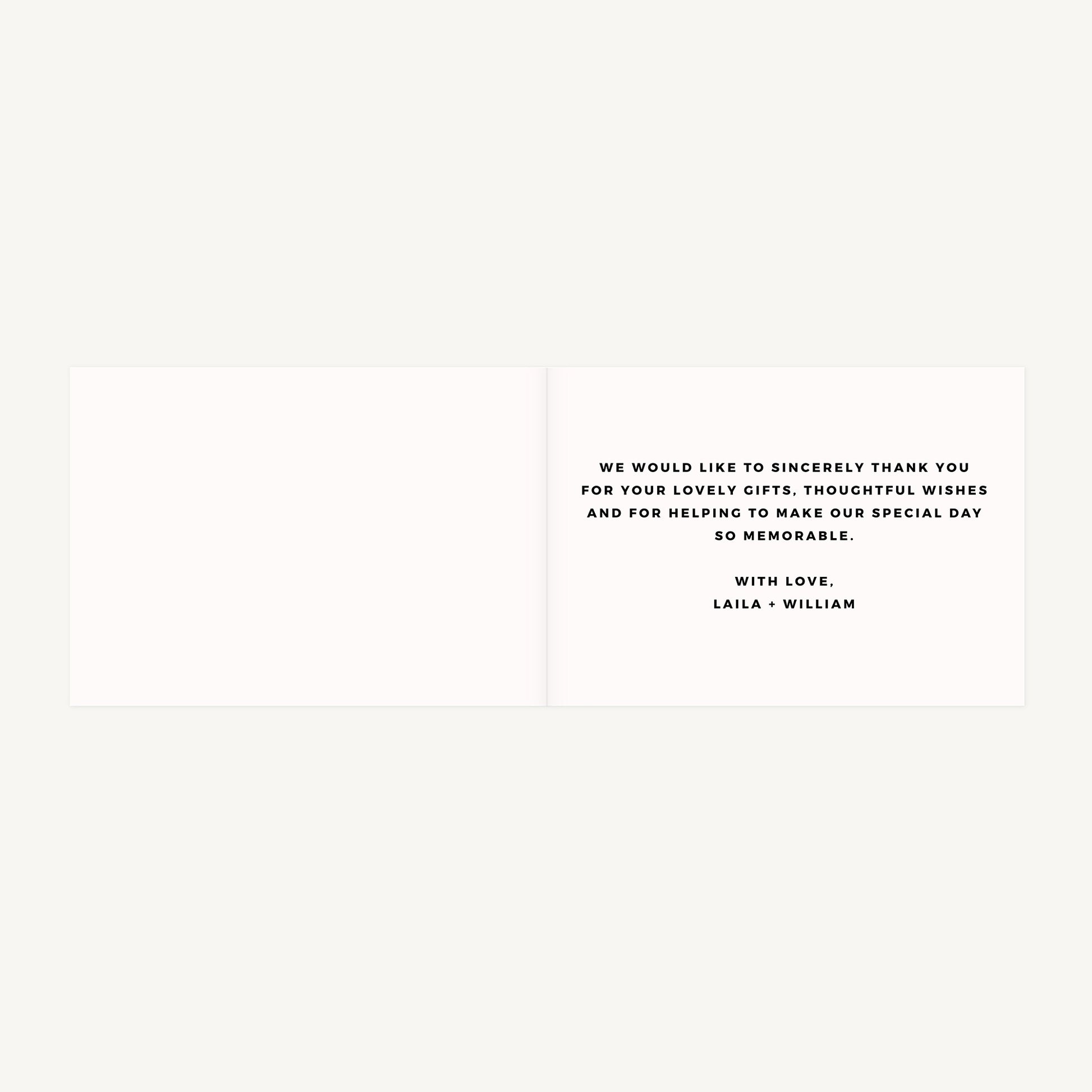 Folded wedding thank you card with printing on all sides and matching blank envelope