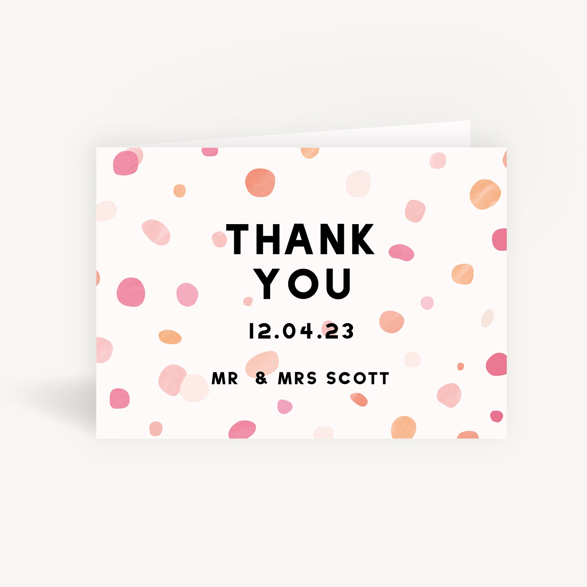 Say a heartfelt thank you to your guests with our Bright Pink Confetti Wedding Thank You Card Folded. Your wording is set in a blocky uppercase sans-serif font which contrasts nicely with the pale colours and dainty confetti. The stationery displays thanks alongside your wedded name and ceremony date, then the card opens to a gracious message inside.