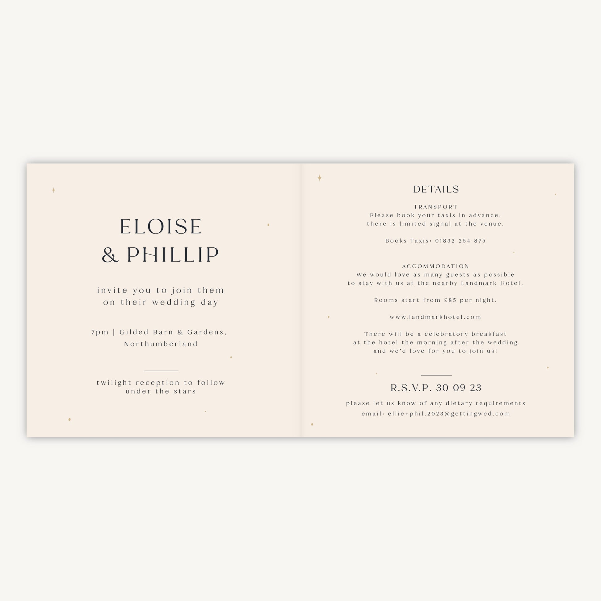 Welcome your guests in style with our classic Celestial Night Sky Folded Wedding Invitation. This decadent design features an ethereal array of twinkling stars atop a deep blue background. The cover introduces the theme of your upcoming wedding and inside addresses your loved ones with the details of the day, plus there is space for additional guest information and RSVP terms on the neighboring page.