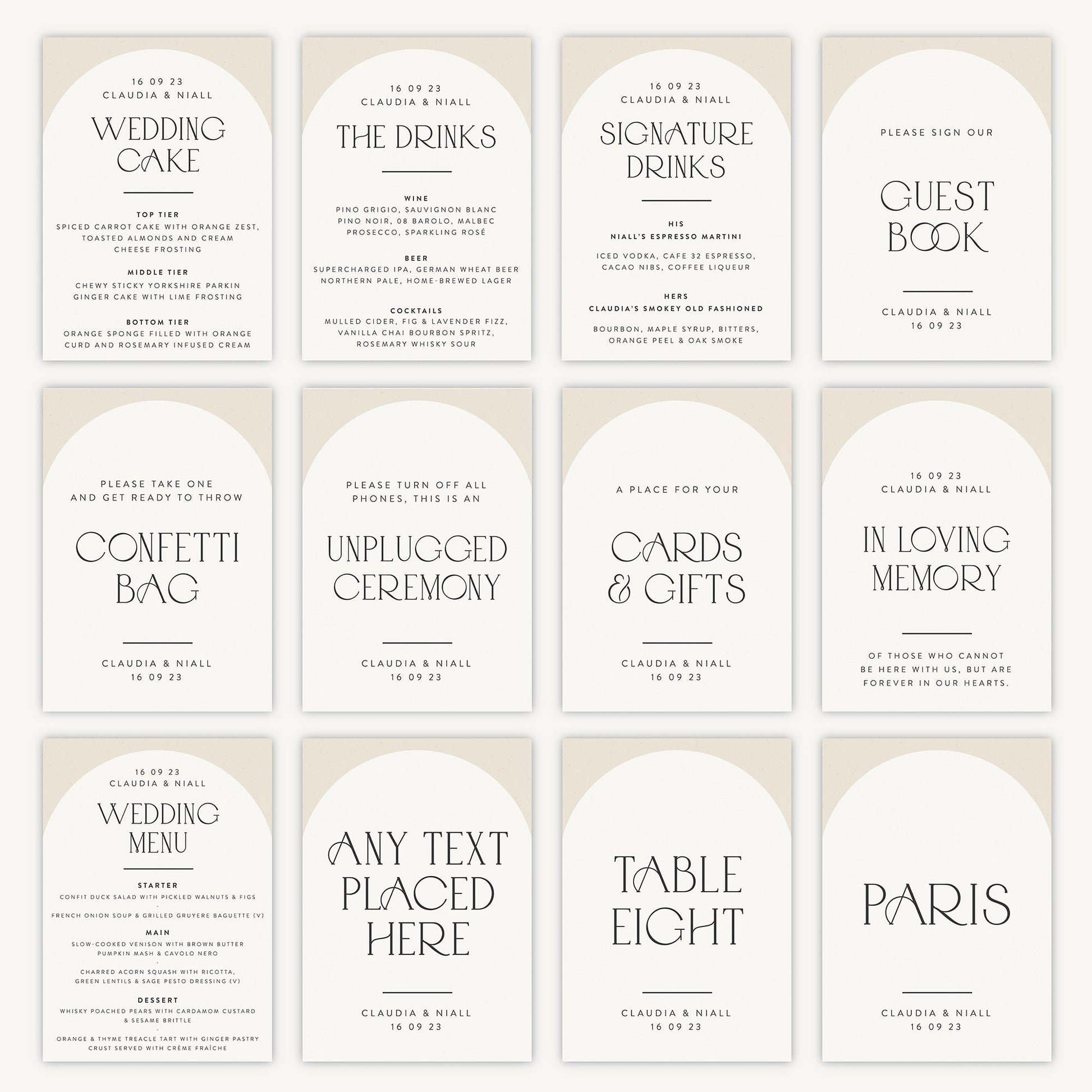 These striking centrepieces showcase your information of choice, names, and wedding date in a modern arch arrangement. Your neutral toned designs are UV printed on sturdy 3mm thick waterproof foamex board which can be displayed to suit your taste both indoors and outside.