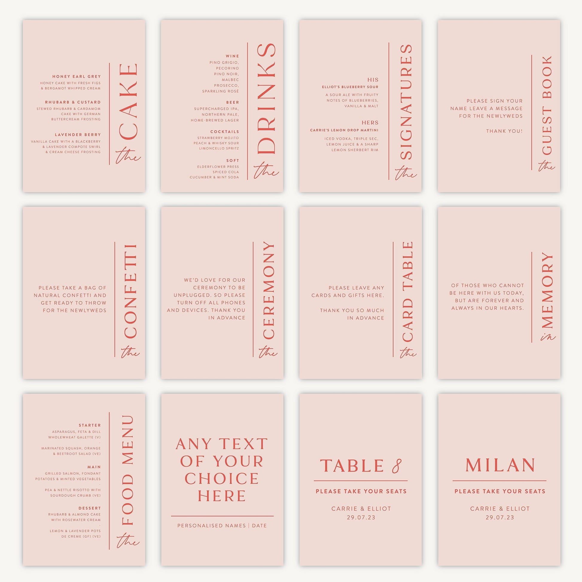 These striking centrepieces showcase your information of choice, names, and wedding date in a unique blush and coral layout. Your designs are UV printed on sturdy 3mm thick waterproof foamex board which can be displayed to suit your taste both indoors and outside.