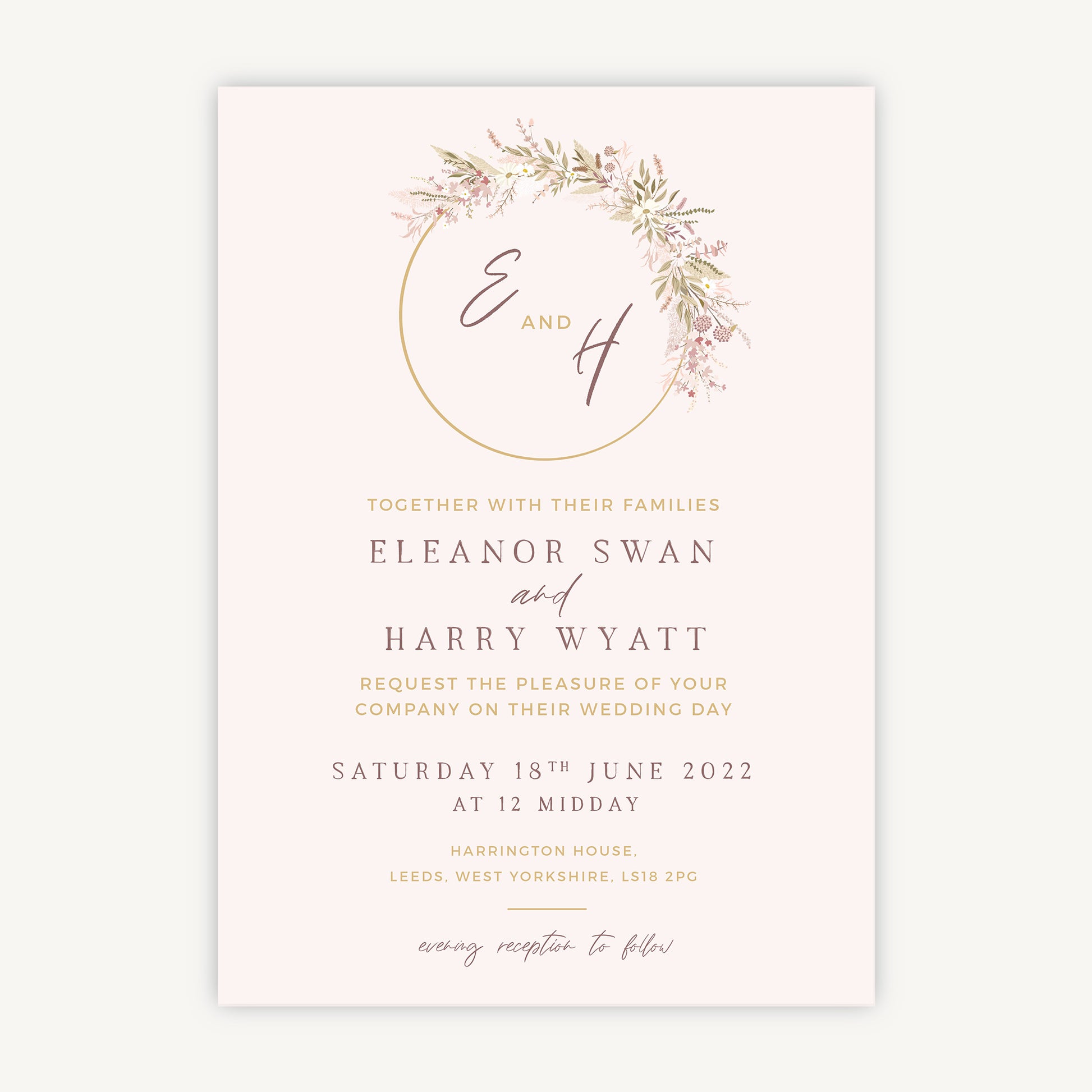 Set the tone for your upcoming wedding with our charming Dried Flower Hoop Wedding Invitation. This pretty design presents illustrated dried florals delicately arranged on a golden hoop with a soft blush background. There’s space for all the important details on the main card with optional extras such as RSVP card and band wrap to create a unique wedding invite.