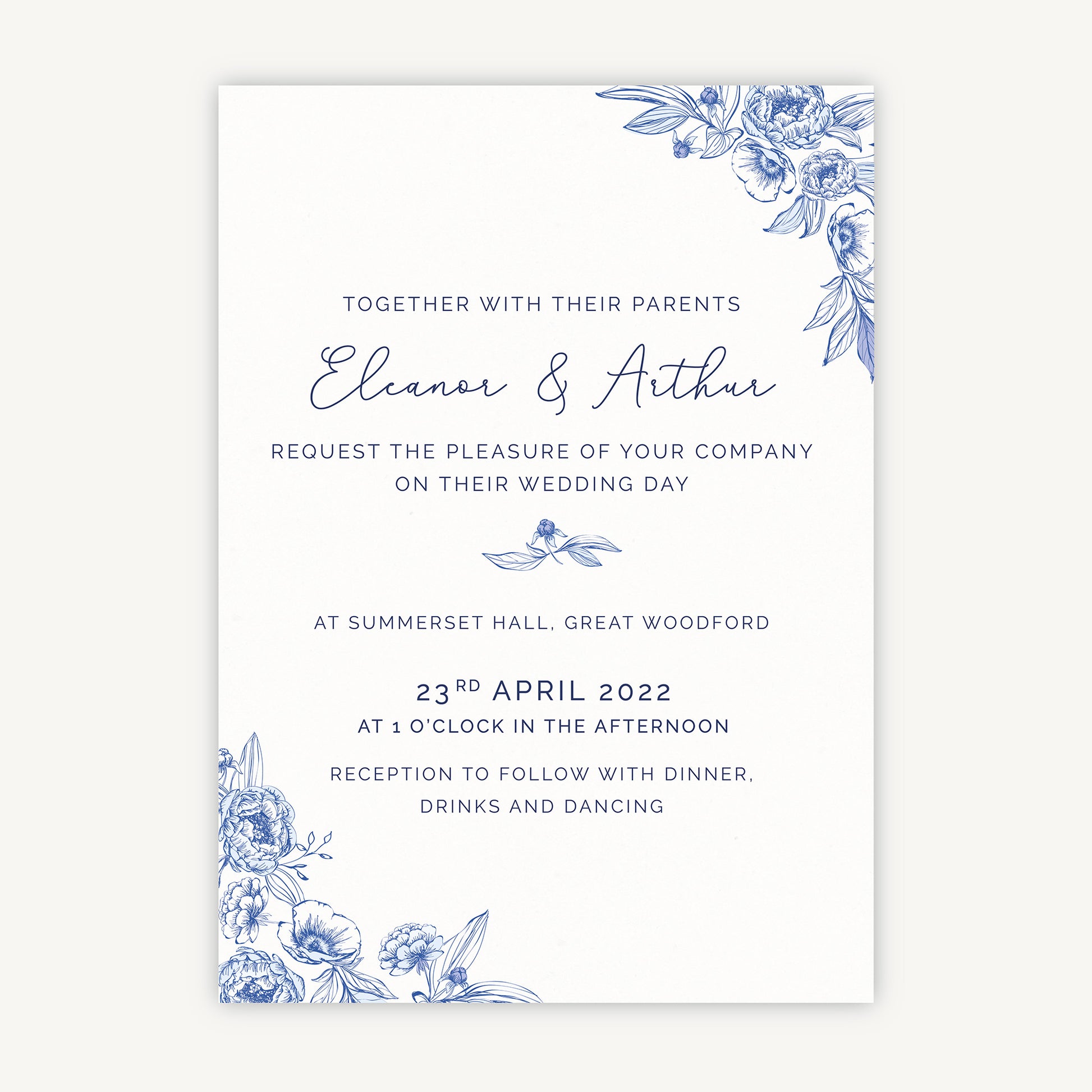 Our Farmhouse Blue Wedding Invitation makes a lovely introduction to your wedding day. This striking composition features a very subtle cream background with beautifully detailed blue floral illustrations arching around the design. There’s space for all the important details on the main card with optional extras such as RSVP card and band wrap to create a unique wedding invite.