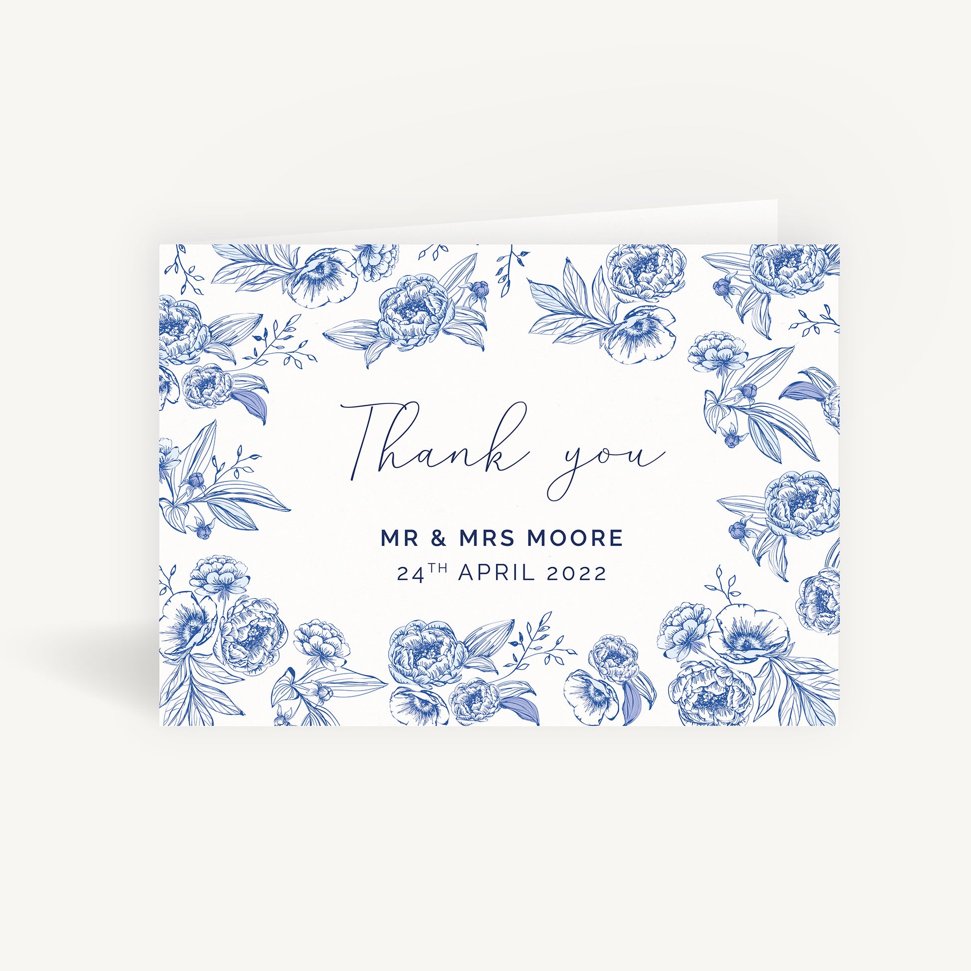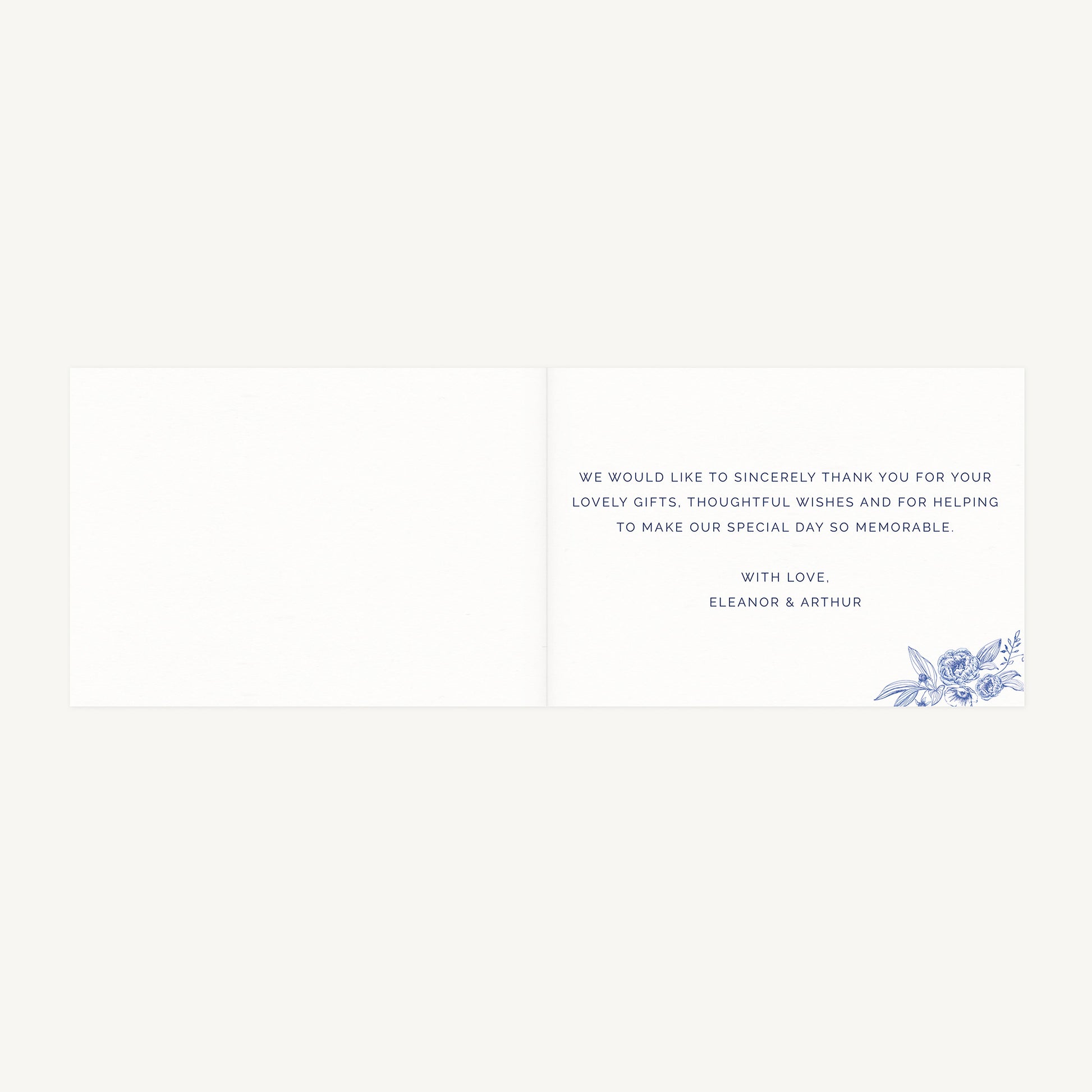 For your guests, wedding party or loved ones sending wishes from afar, our Farmhouse Blue Wedding Thank You Card Folded is a lovely way to show your gratitude for everyone who made the big day so special. This striking composition features a very subtle cream background with beautifully detailed blue floral illustrations arching around the design. The delicate folded card sends thanks above your newly wedded names and date on the front and inside there is space for your heartfelt message of gratitude.