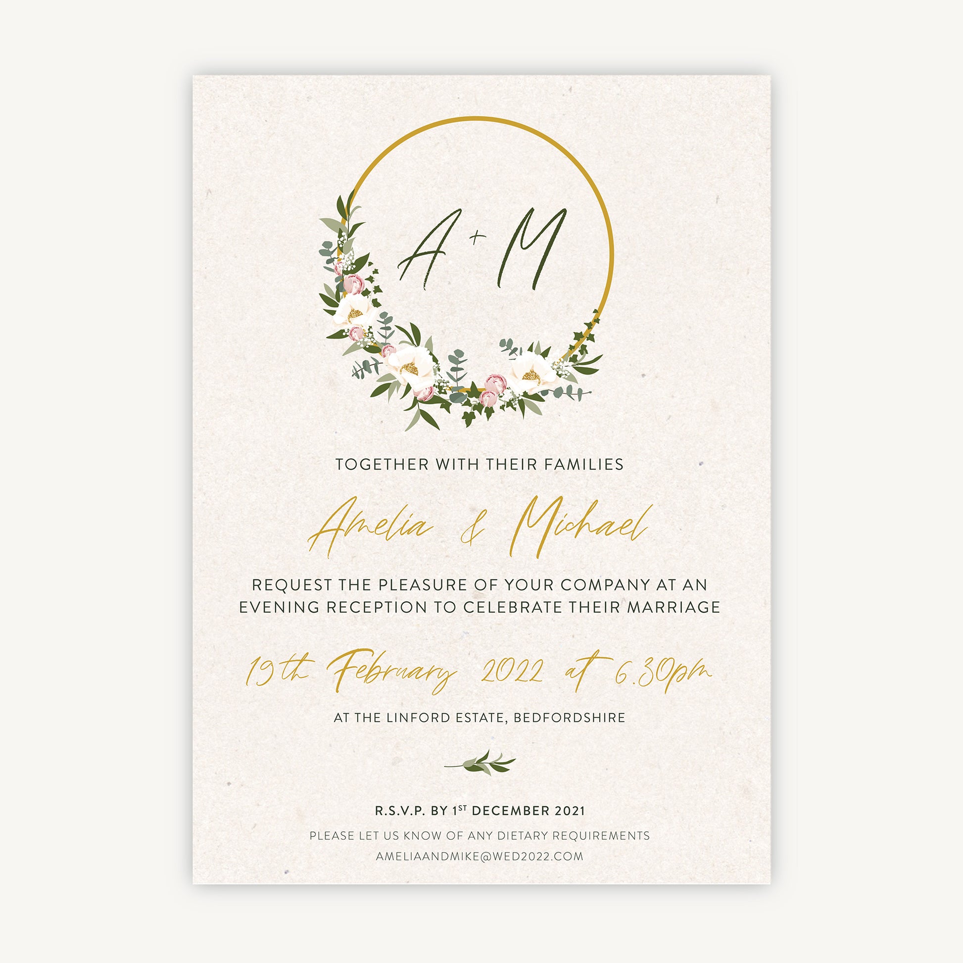 Announce all the official details with our elegant Floral Hoop Evening Wedding Invitation. The illustrations combine a variety of rich green leaves with dainty gypsophila and pretty pink and white peonies. The unique composition allows for a curated welcome message and the evening's important details alongside your RSVP date and contact information.