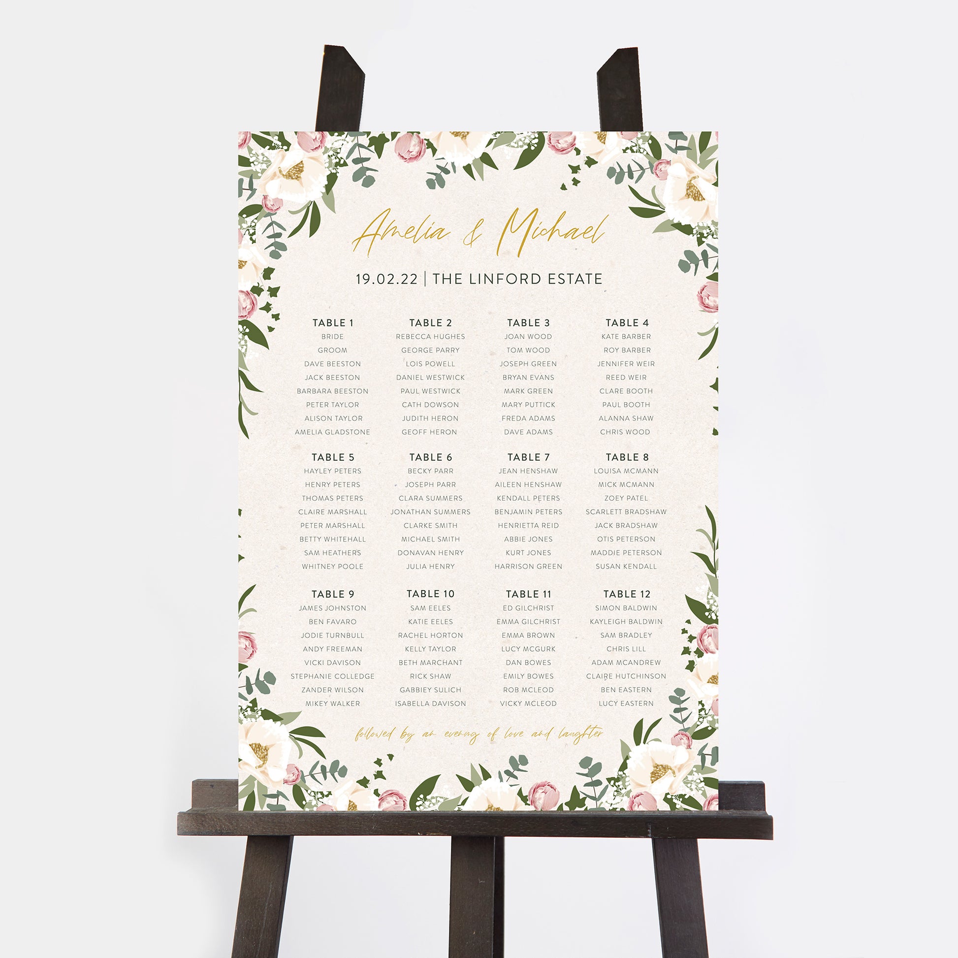 Our Floral Hoop Wedding Table Plan is a charming way to show your guests where they will be enjoying the reception. Your text is set in a mixture of a golden handwritten script font with a sans-serif capitalised type. The sleek board features the happy couple’s names above their wedding date and venue before the clear arrangement of personalised table and guest names.