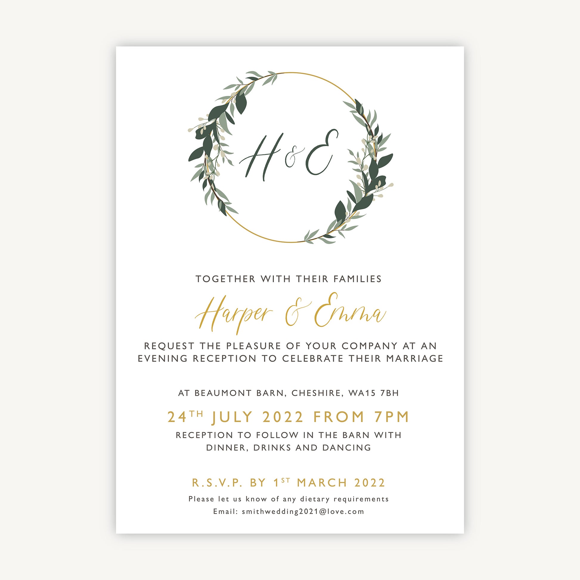 Our Foliage Hoop Evening Wedding Invitation makes a lovely introduction to your special day. The illustrations combine a variety of rich green leaves with eucalyptus and rustic berries. Invite your loved ones to join in the celebrations by setting down all the important details and RSVP information on the card.