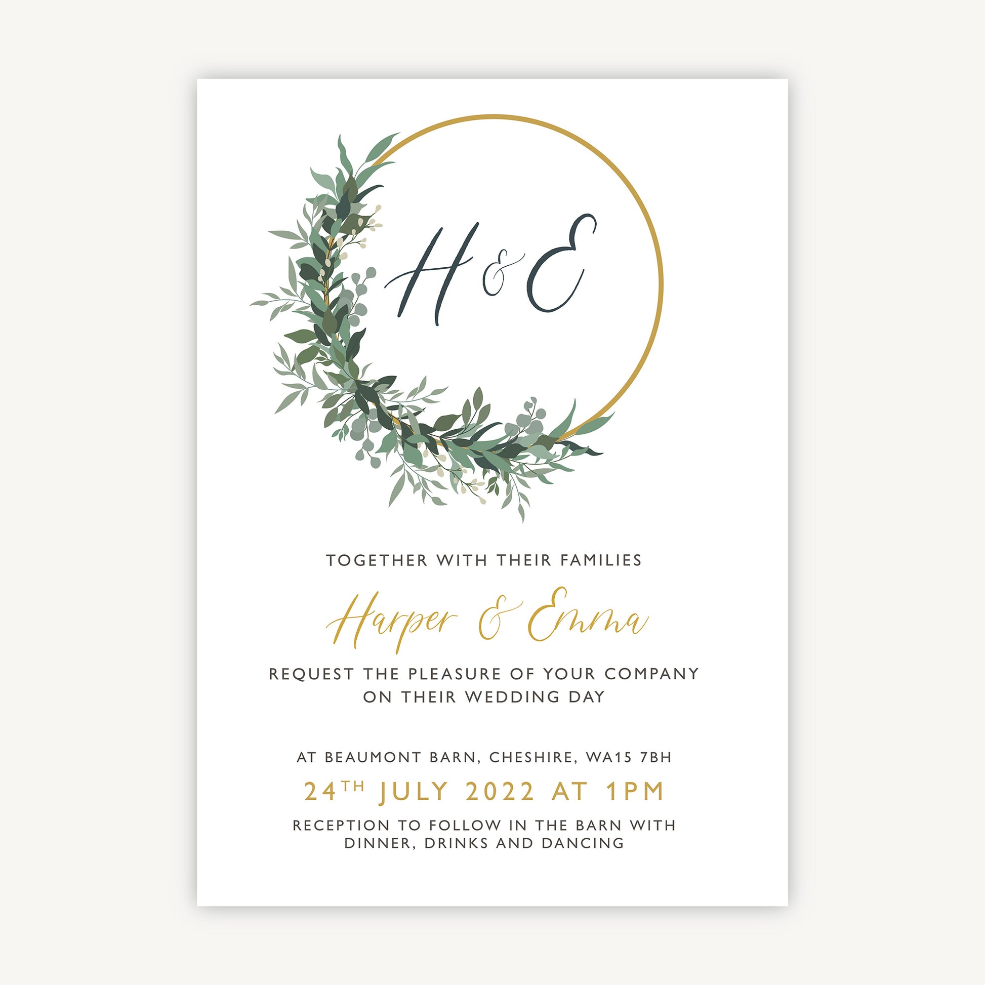 Set the tone for your upcoming wedding with our beautiful Foliage Hoop Wedding Invitation. This stylish design features a crisp white background with botanical inspired illustrations in a hoop formation. There’s space for all the important details on the main card with optional extras such as RSVP card and band wrap to create a unique wedding invite.