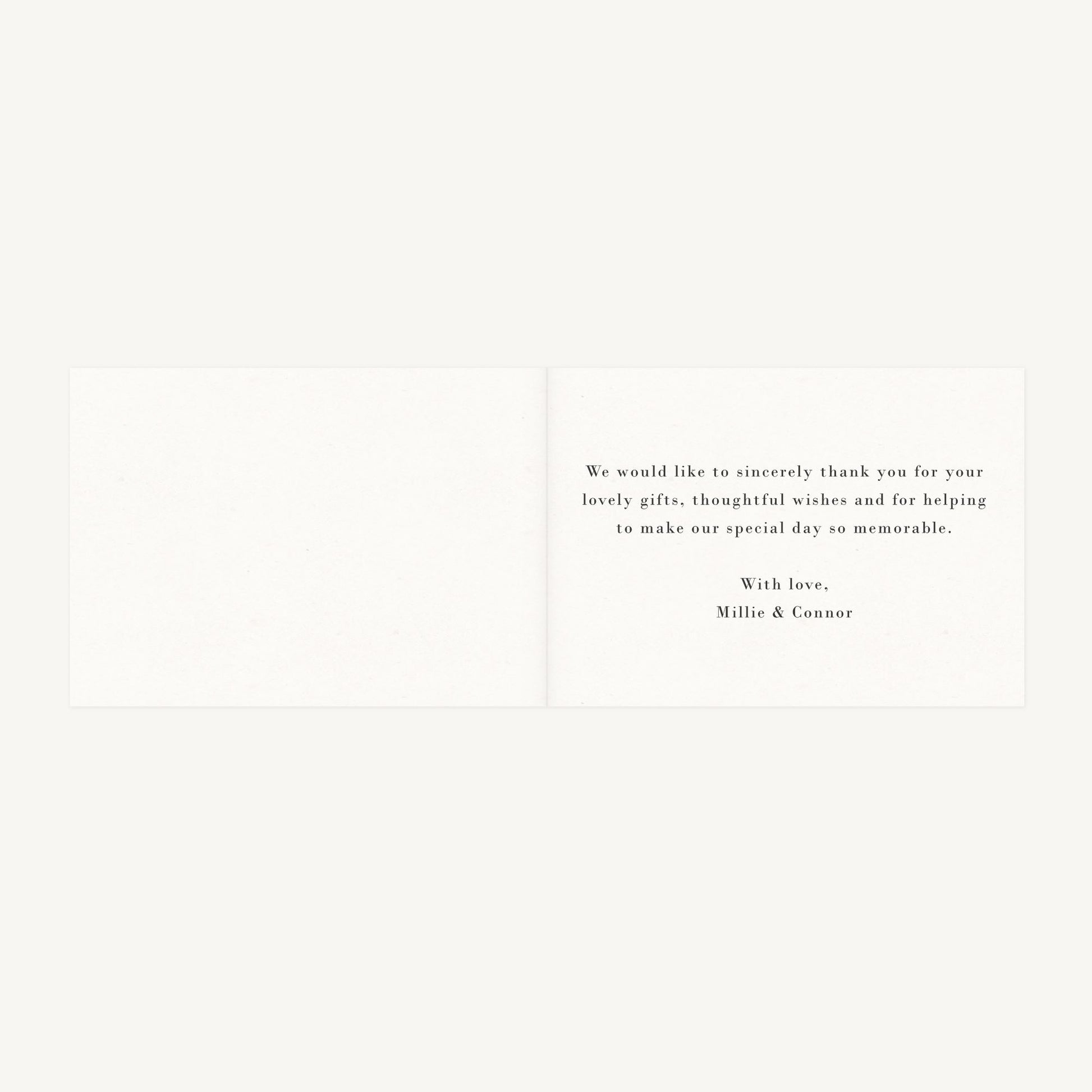 Folded wedding thank you card with printing on all sides and matching blank envelope