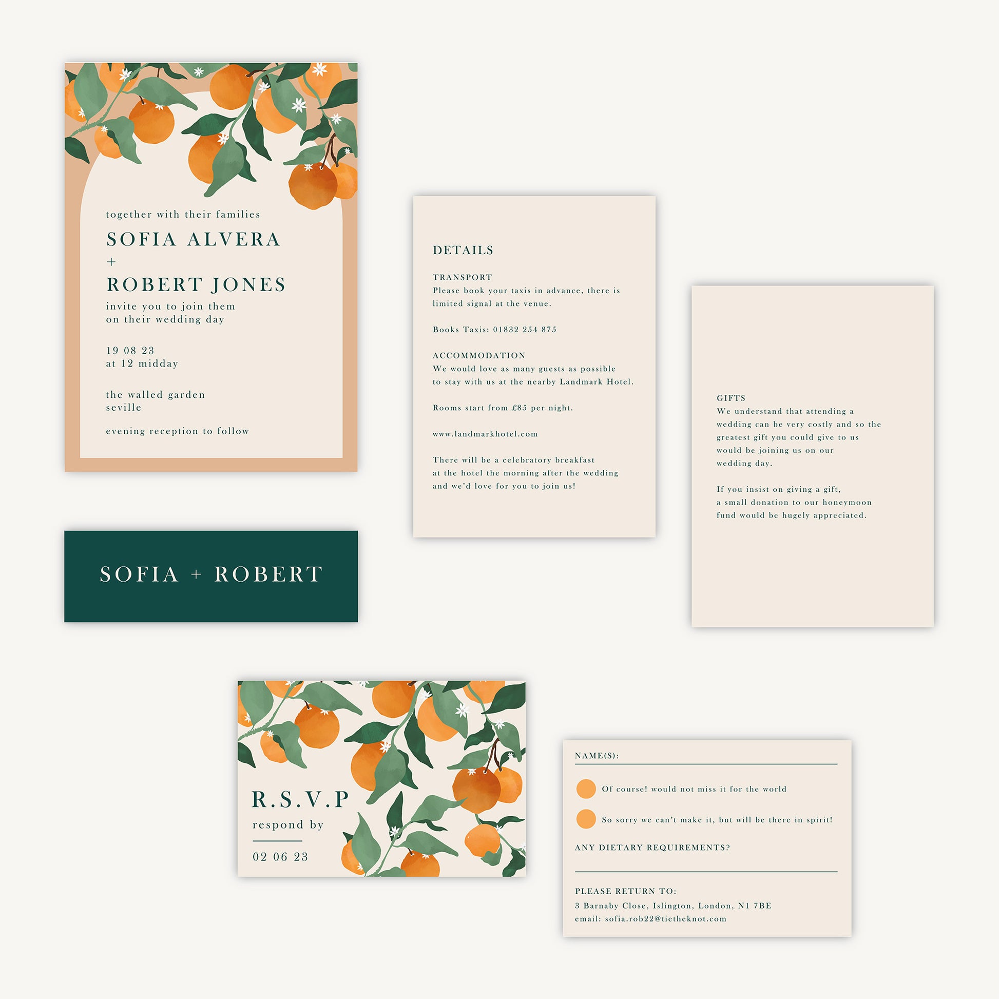 Our Mediterranean Oranges Wedding Invitation makes a lovely introduction to your wedding day. The illustration displays gorgeous textured citruses, rich greenery and orange blossoms in varying compositions across the collection. All the essential information is printed on the invite which can be embellished with a wrap-around band, RSVP card and an additional card for finer details if needed.
