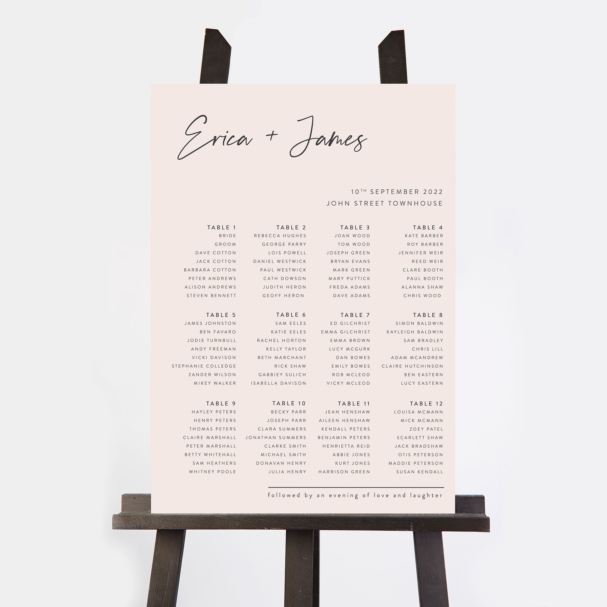 Guide your loved ones to their seats with our delightful Minimal Script Wedding Table Plan. Your main text is printed in upper and lowercase variations of a sans-serif geometric font which is paired with a striking handwritten script. The sleek board features the happy couple’s names above their wedding date and venue before the clear arrangement of personalised table and guest names.