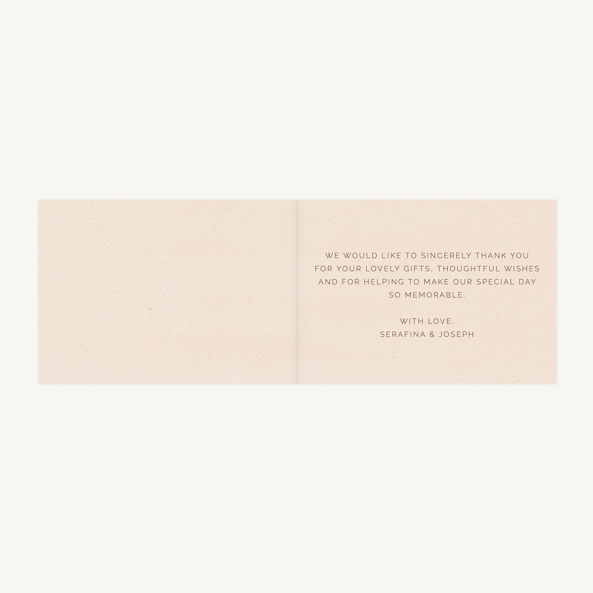 Say a heartfelt thank you to your guests with our Palm Beach Wedding Thank You Card Folded. Your wording is set in a brown geometric sans serif with embellishments of a beautifully stylish uppercase font. The stationery displays thanks alongside your wedded name and ceremony date, then the card opens to a gracious message inside.