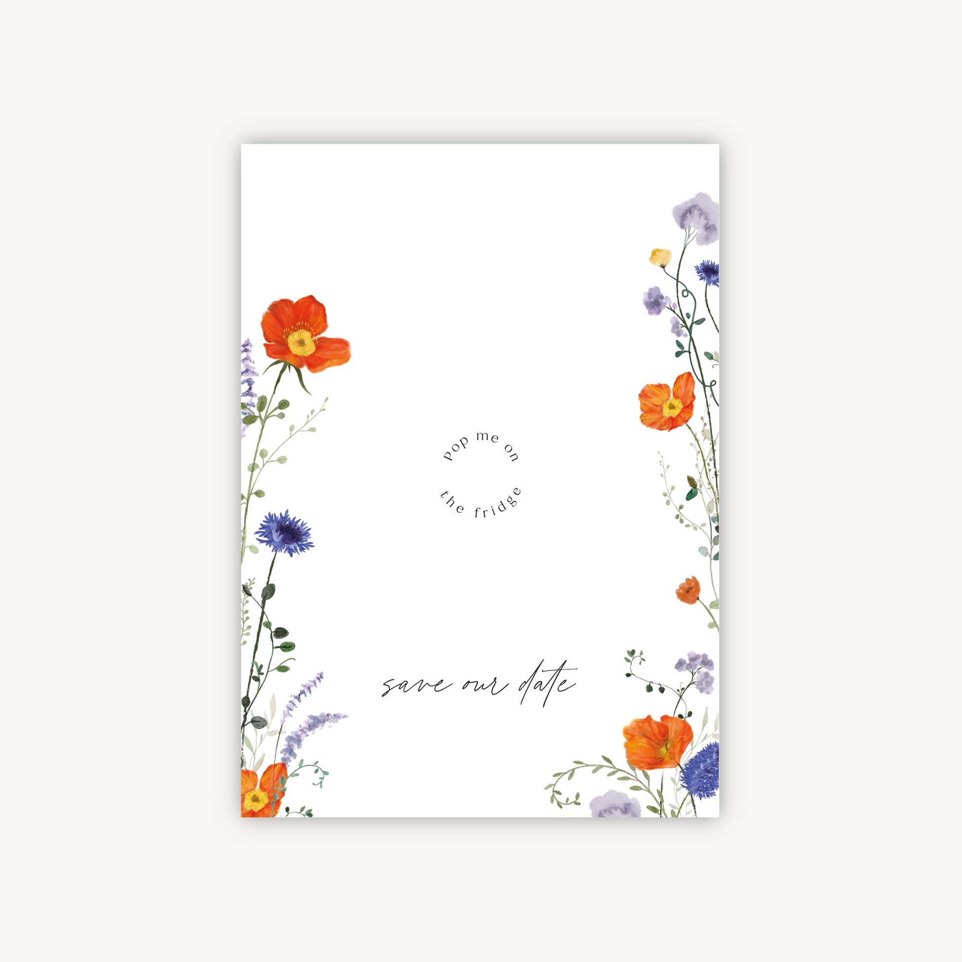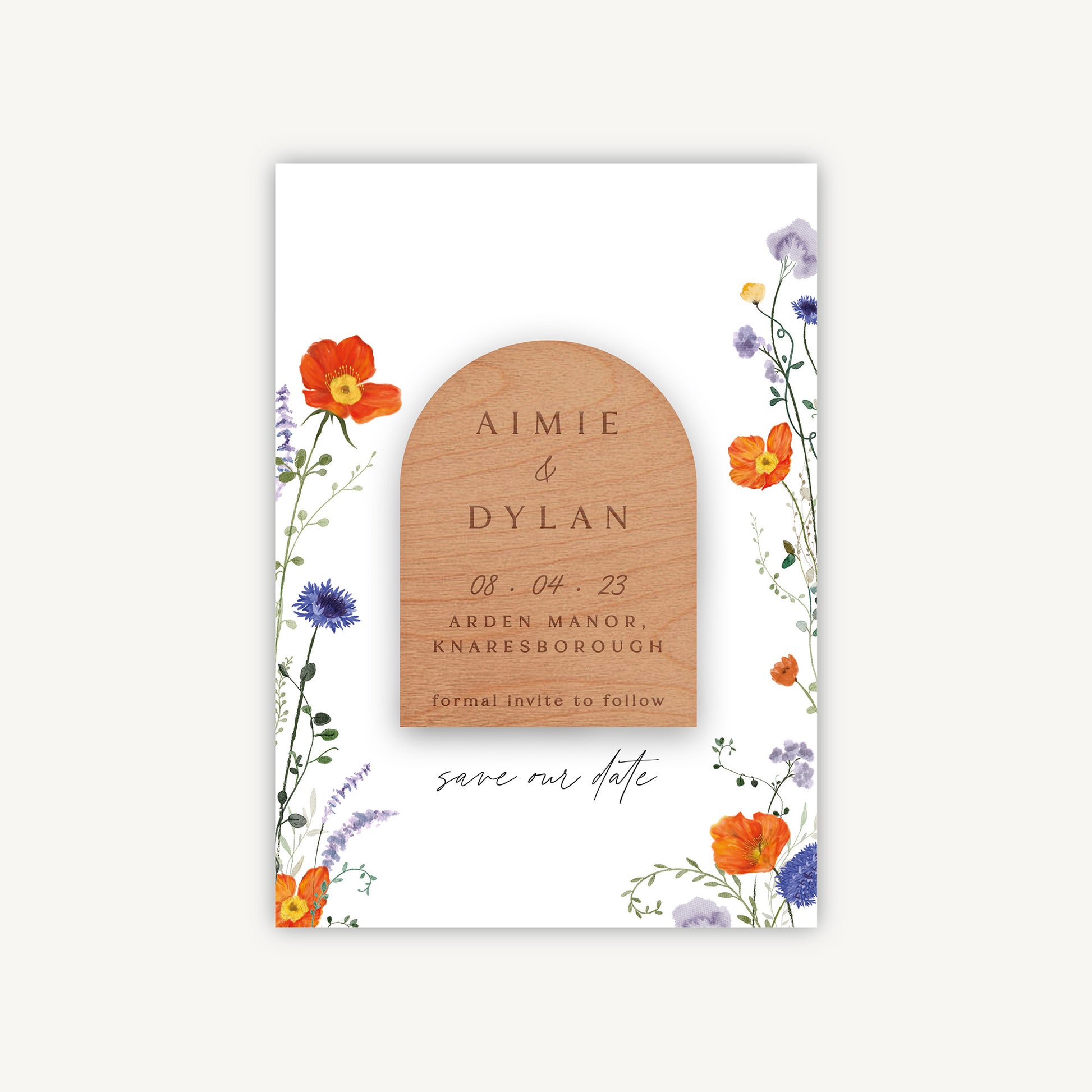 Our Pressed Wildflowers Wooden Magnet Save the Date is a beautiful keepsake for your guests that ensures they remember the date of your big day. The illustration features an array of lovely wildflowers, including bright poppies, lavender and greenery, curving upwards on either side. The sleek card holds a beautifully engraved wooden magnet that features the happy couple’s names, their wedding date, venue, and tasteful detailing.