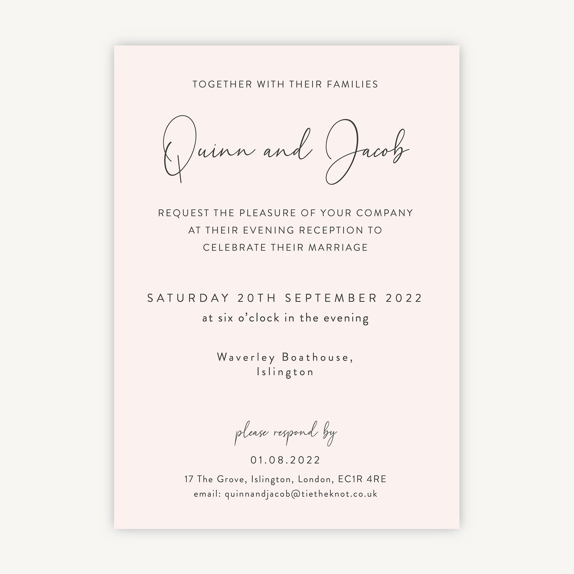 Set the tone for your wedding celebrations with our beautiful Romantic Script Evening Wedding Invitation. The font pairing, spacing, and pale background give a modern quality to the traditionally romantic design. There is space for a warm welcoming message alongside venue information, important times, and RSVP terms on this timeless curated card.