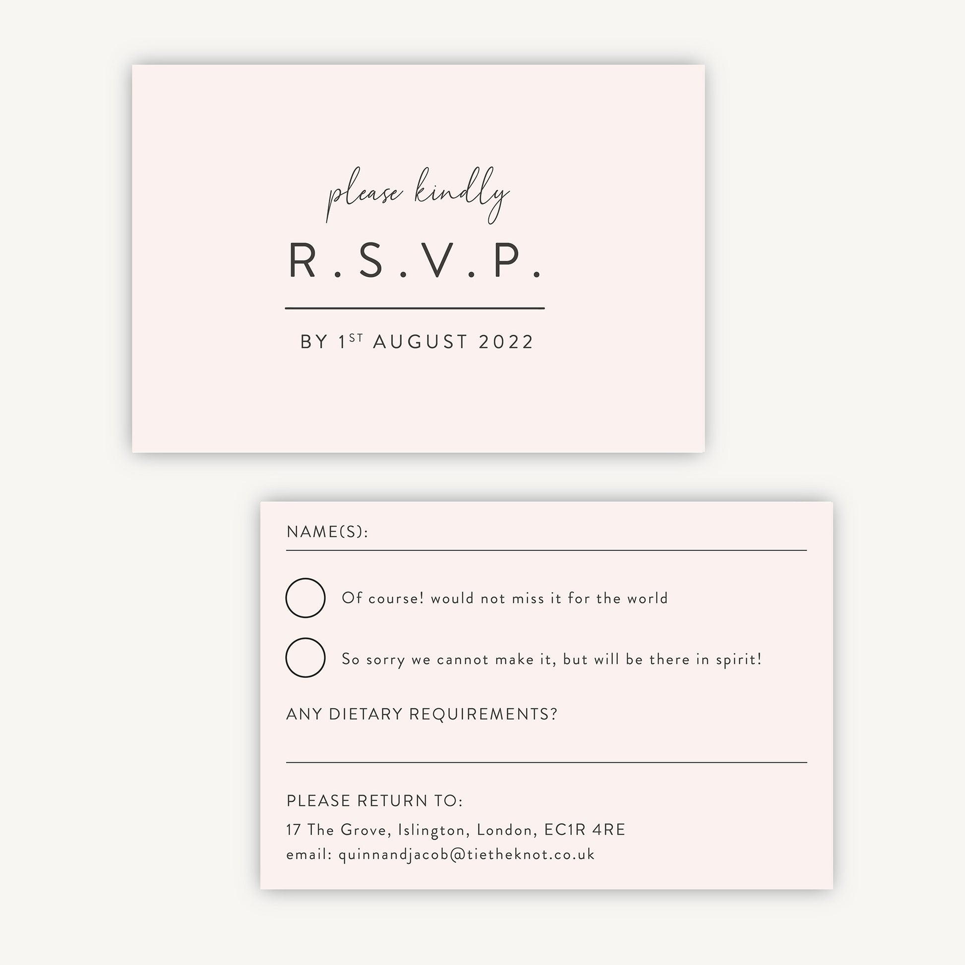 Guests can easily respond to your invitation with this matching Romantic Script RSVP card. This elegant design focuses on a beautiful script typeface and open space with a pale blush background. There is space for all the essential information including an RSVP date, dietary requirements, returns addresses and contact details.