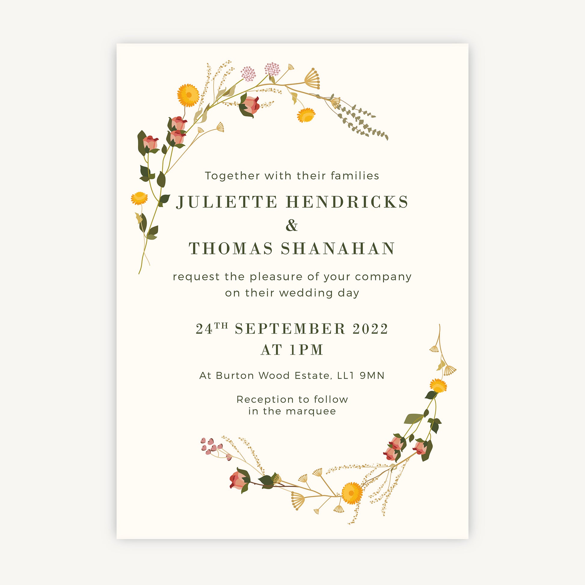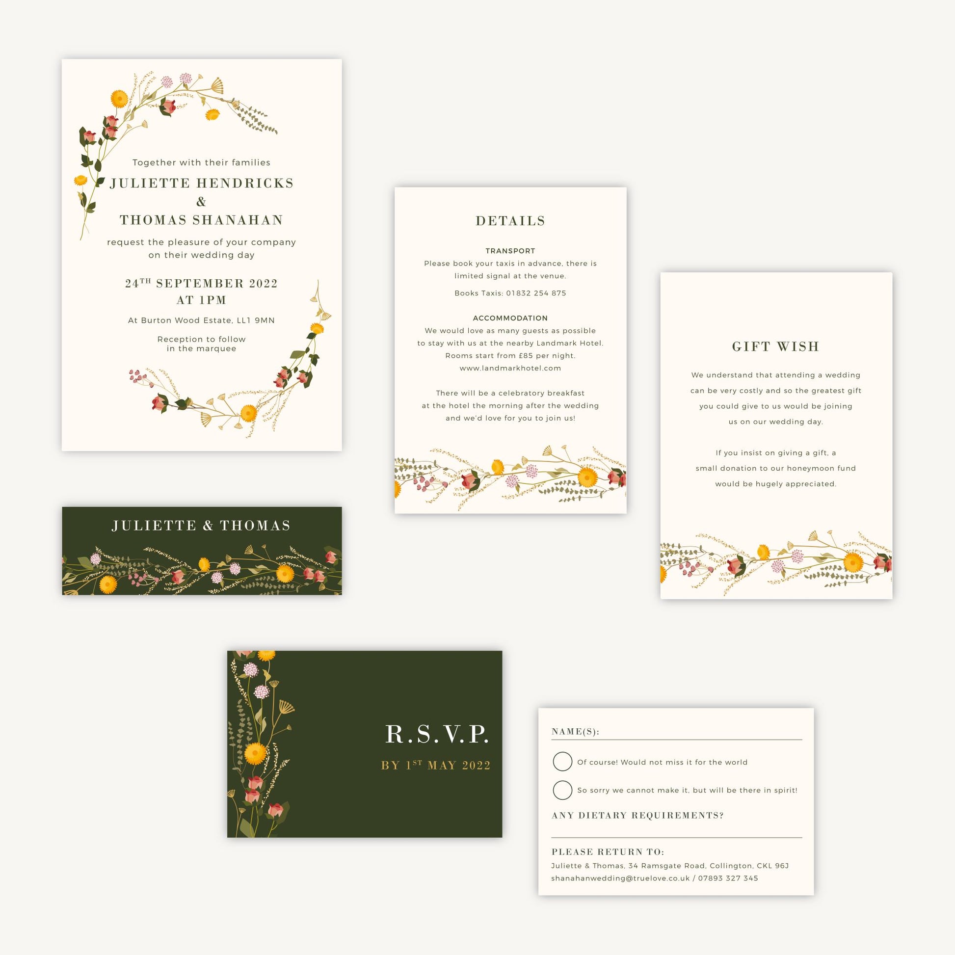 Set the tone for your upcoming wedding with our Rustic Wildflowers Wedding Invitation. This autumnal composition features a soft cream background with a beautiful array of illustrated wildflowers arching around the design. The main card holds the fine details of the day which can be supplemented with a RSVP card, an additional information card and an elegant band that holds the stationery together.