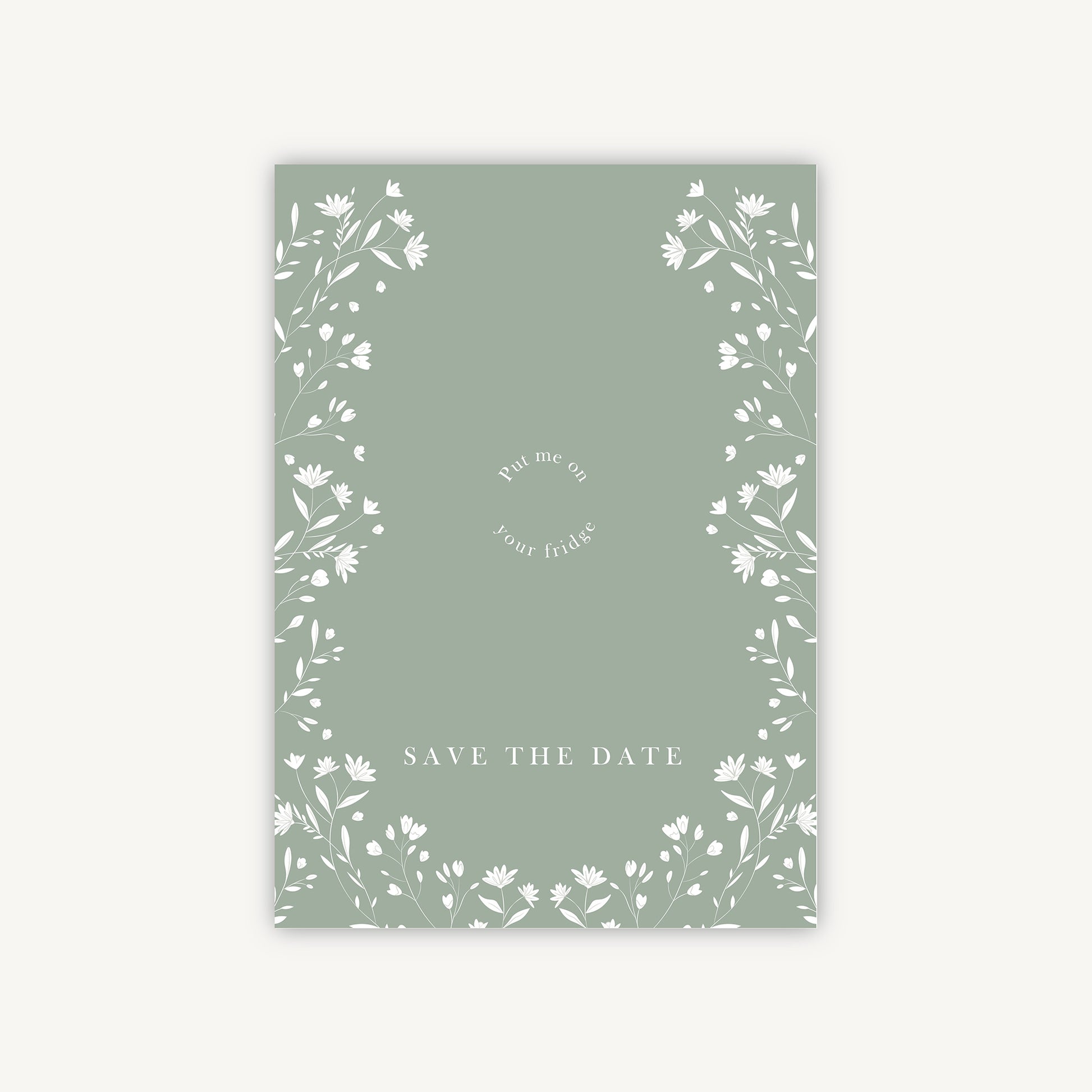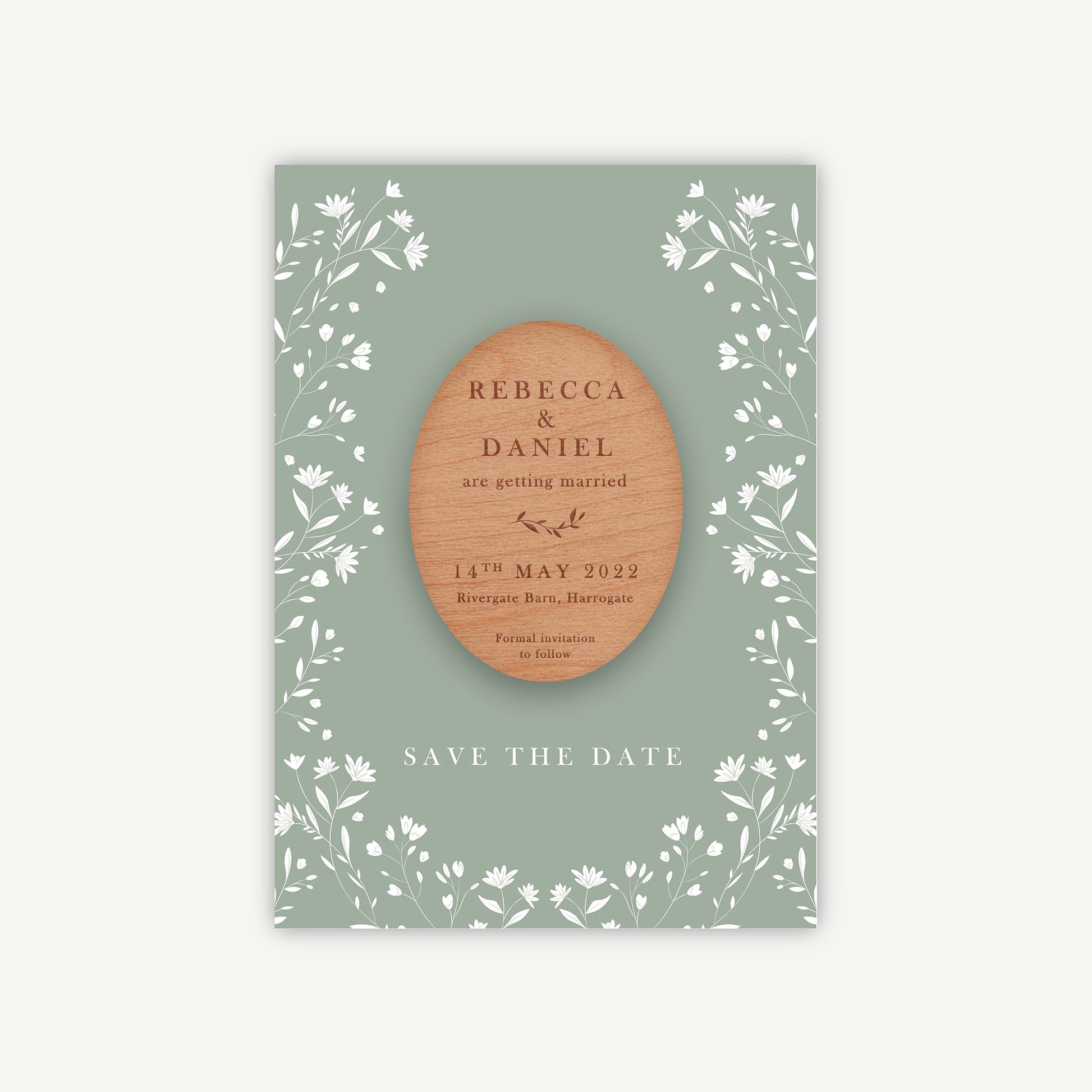 Our Sage Wildflower Wooden Magnet Save the Date is wonderful way to spread the news of your upcoming wedding. This ethereal collection consists of a muted sage background adorned with delicate white wildflower illustrations. Attached to an elegant card, our wooden magnet is engraved with the important details of your wedding day and complimentary styling.