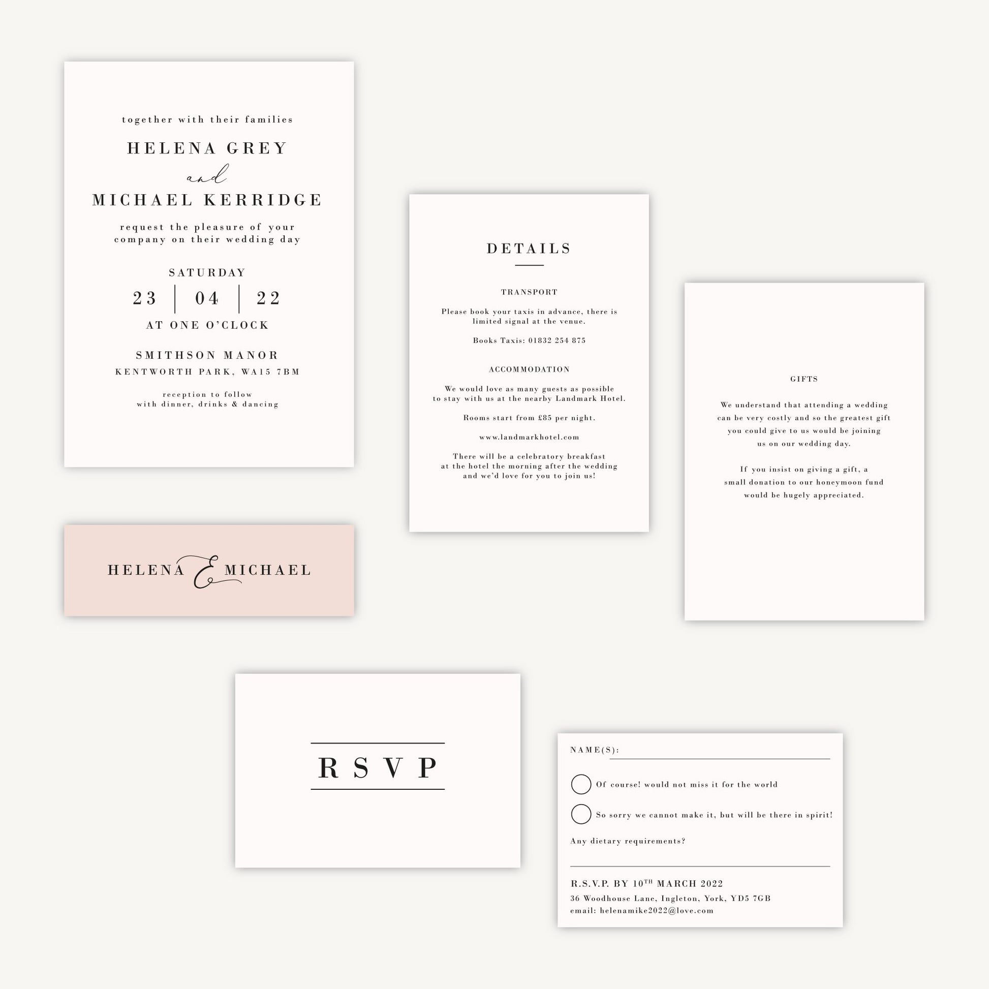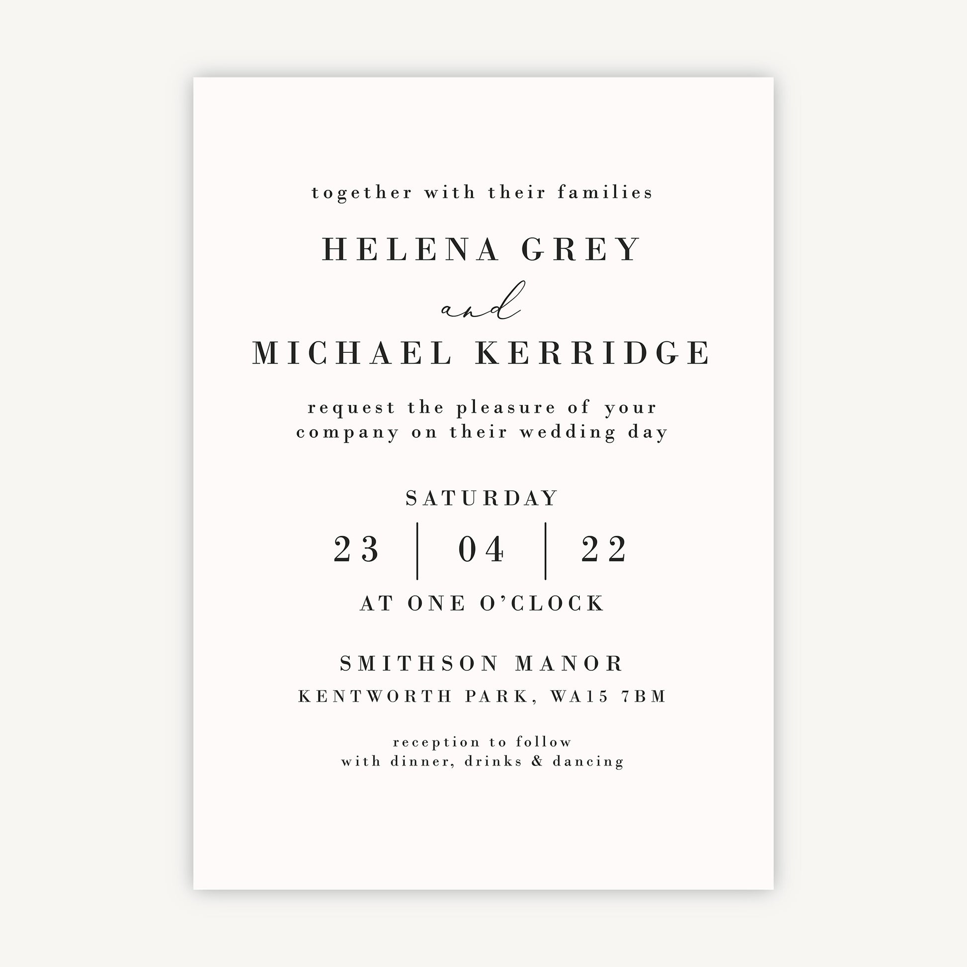 Set the tone for your upcoming wedding with our beautiful Simple Script wedding invitation. This minimal design focuses on elegant script flourishes and clean space with a pale blush background. There's space for all the important details on the main card with optional extras such as RSVP card and band wrap to create a unique wedding invite.