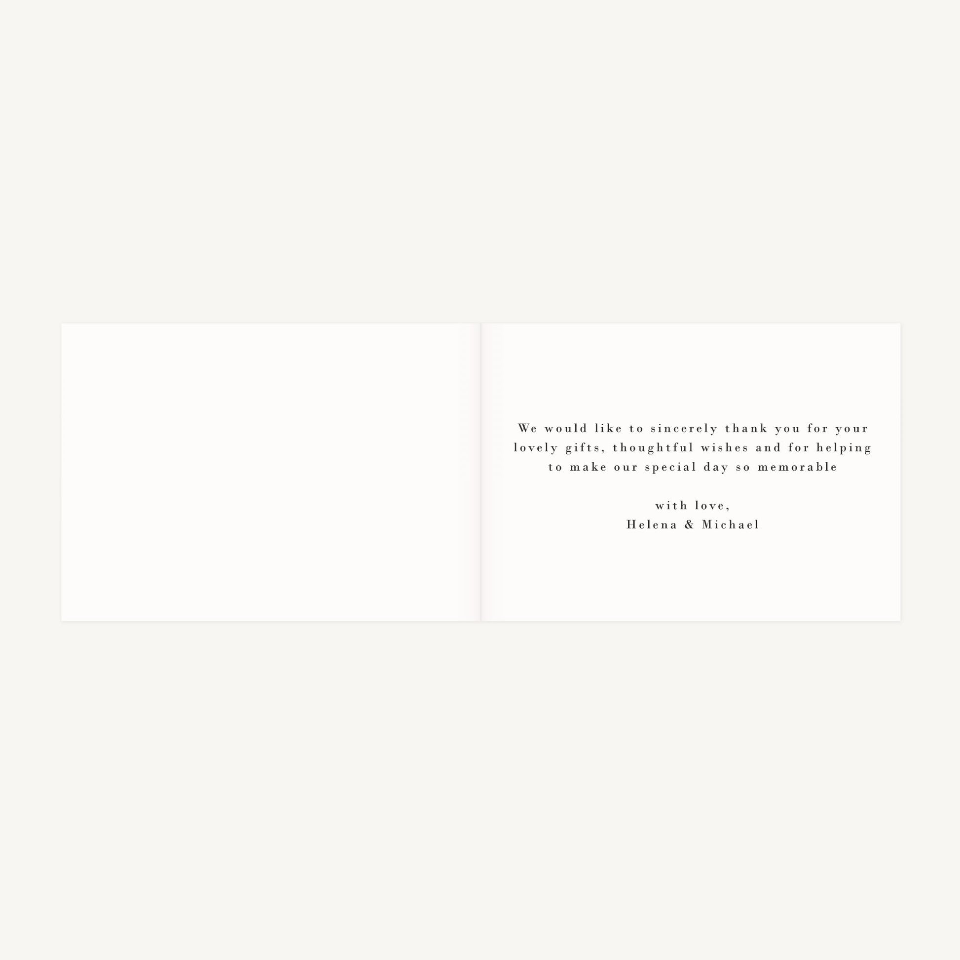 Folded wedding thank you card with printing on all sides and matching blank envelope
