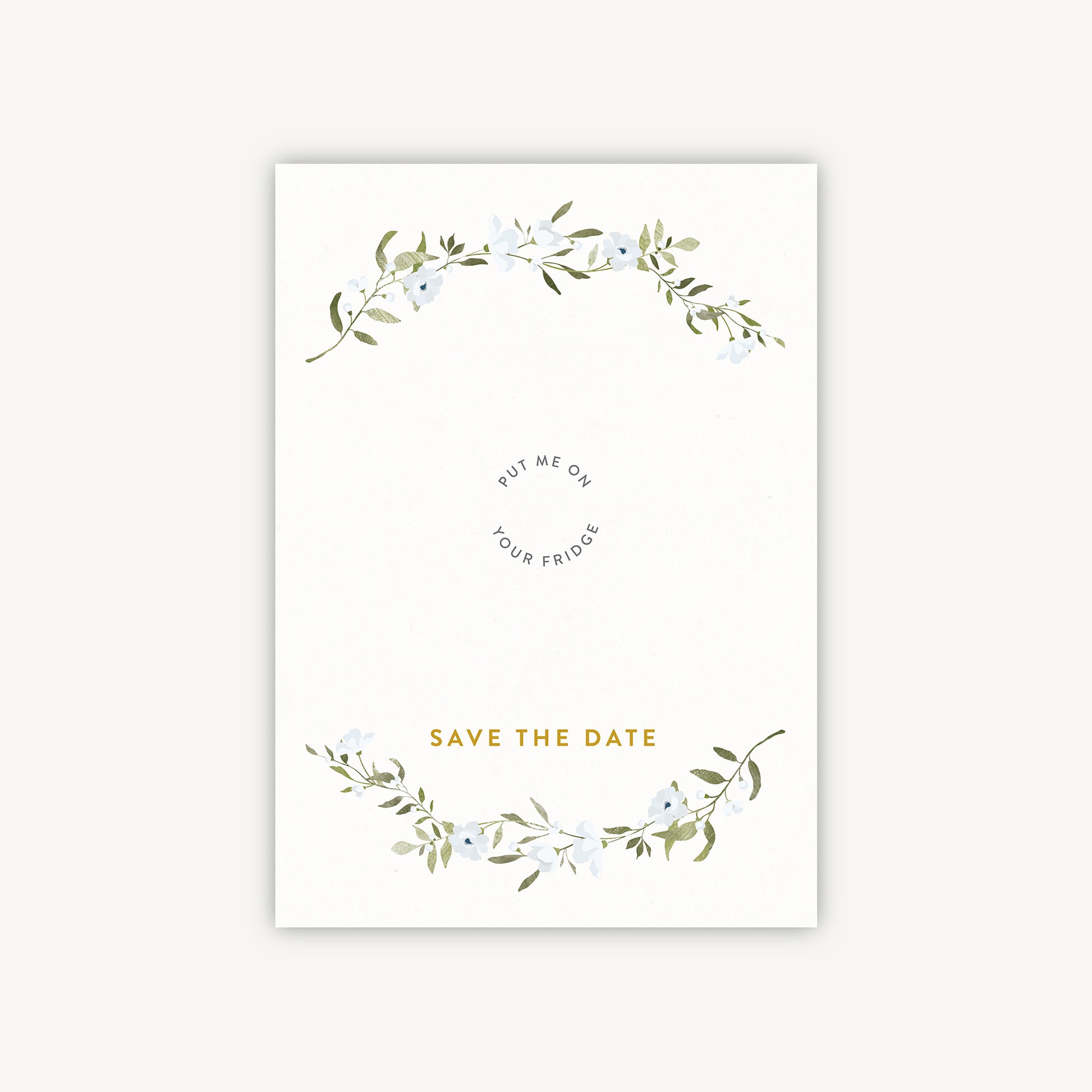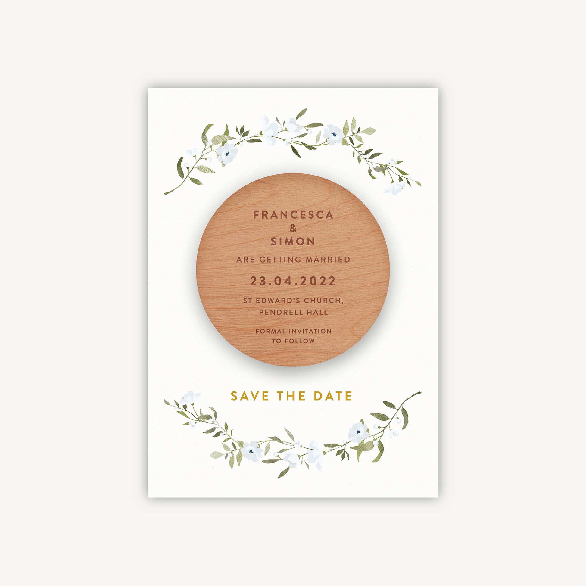 Take the first step of announcing your wedding with our Spring Flowers Wooden Magnet Save the Date. This elegant design features beautiful soft blue floral illustrations arching around the text on a subtle cream background. The personalised names of the couple, their wedding date, and venue are intricately engraved onto a charming wooden magnet that sits atop a smooth backing card.
