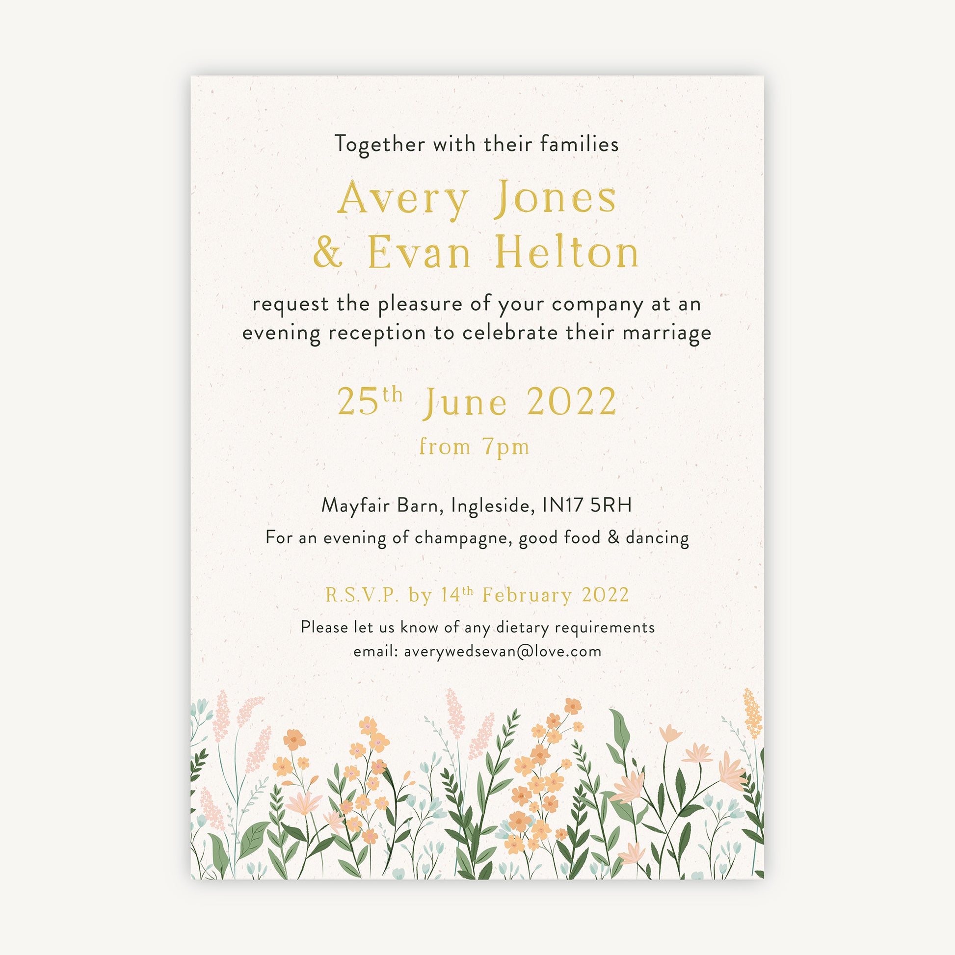 Our Summer Meadow Evening Wedding Invitation makes a lovely introduction to your wedding celebrations. The body of your text is printed in a deep green sans-serif font with names and dates set in a golden rustic serif typeface. There is space for a warm welcoming message alongside venue information, important times, and RSVP terms on this timeless curated card.