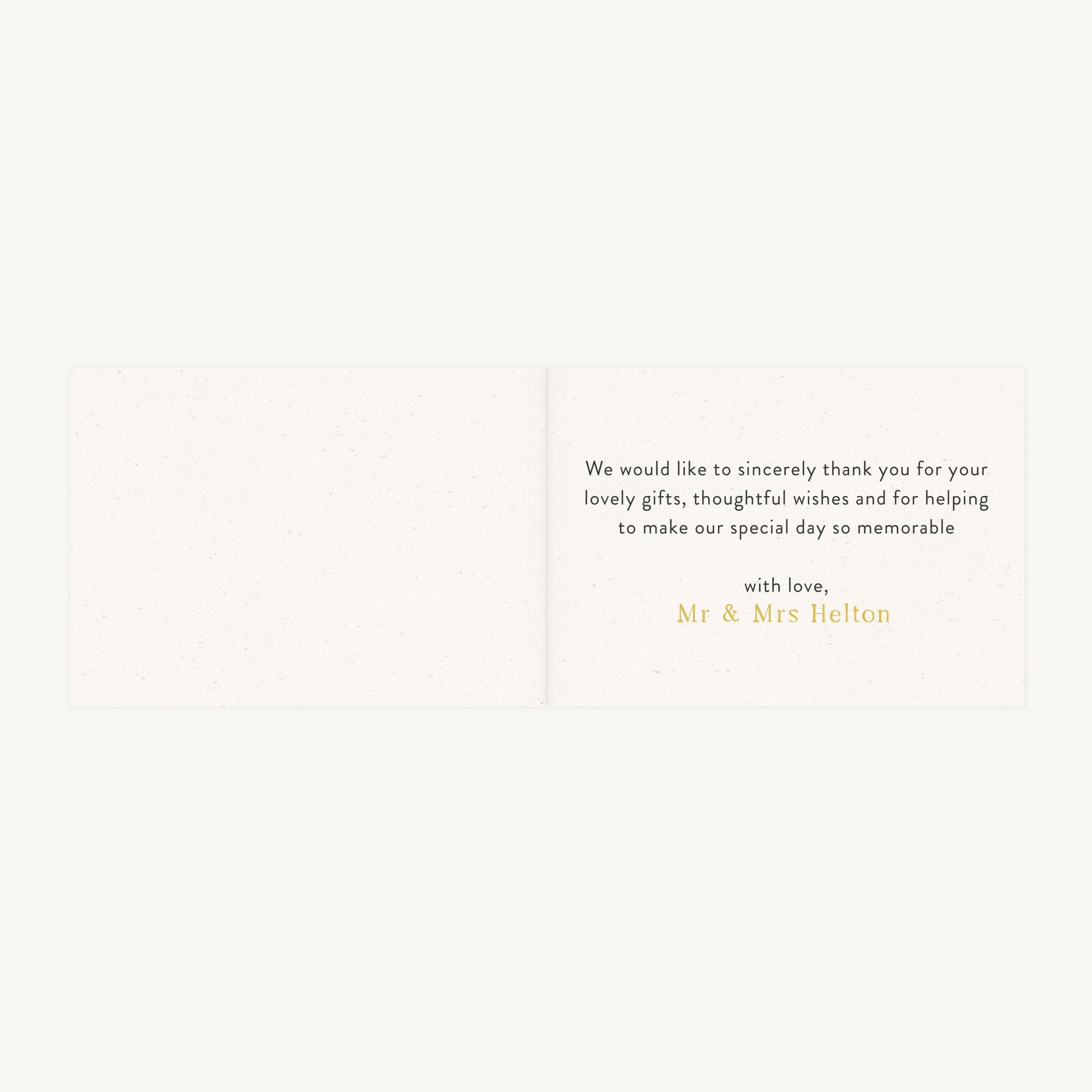 Folded wedding thank you card with printing on all sides and matching blank envelope