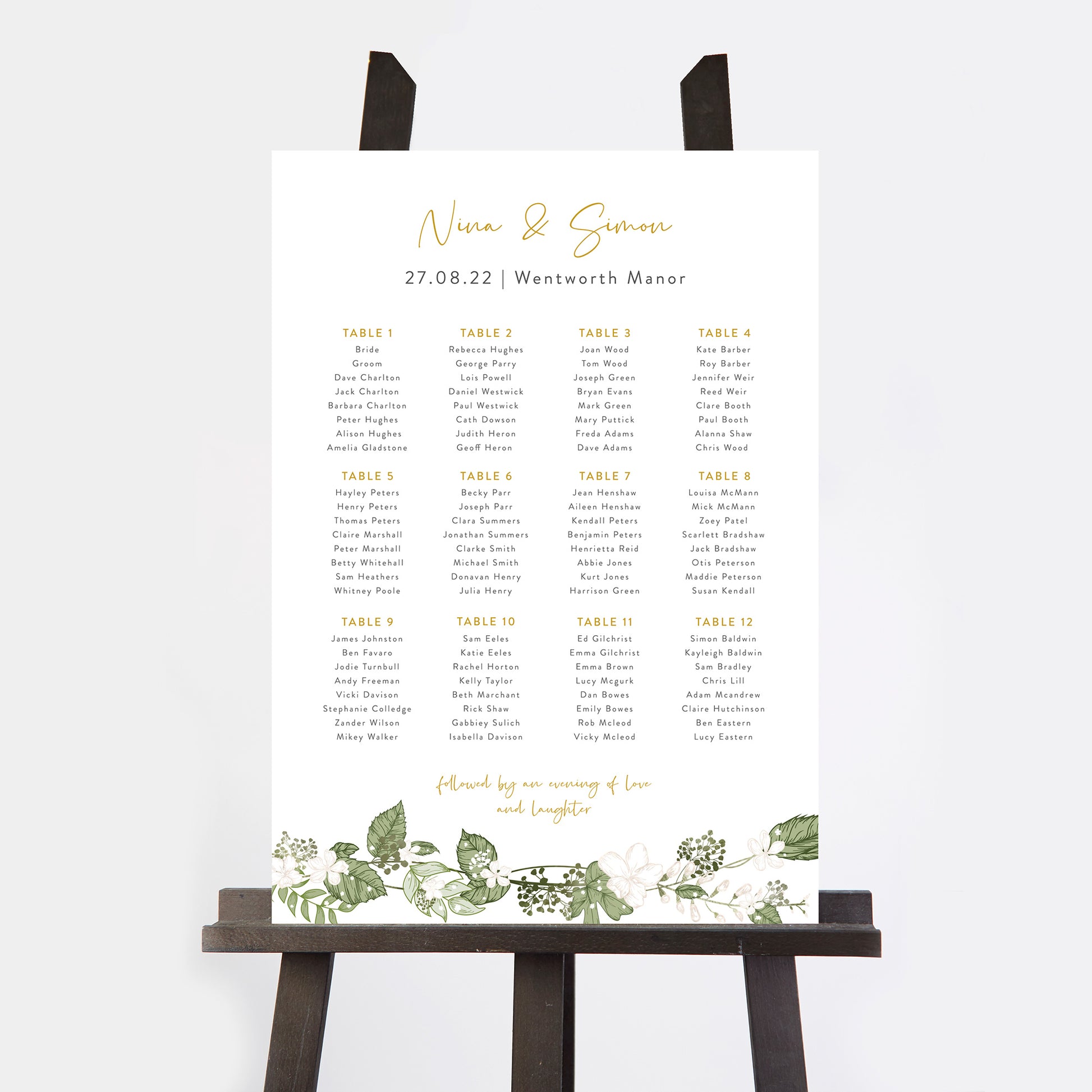 Share your curated seating arrangements in style with our White Floral Wedding Table Plan. This sophisticated design features densely illustrated floral greenery on a crisp white background. Your curated arrangement of guests is neatly displayed with corresponding table names beneath the wedding details of the newlywed couple.