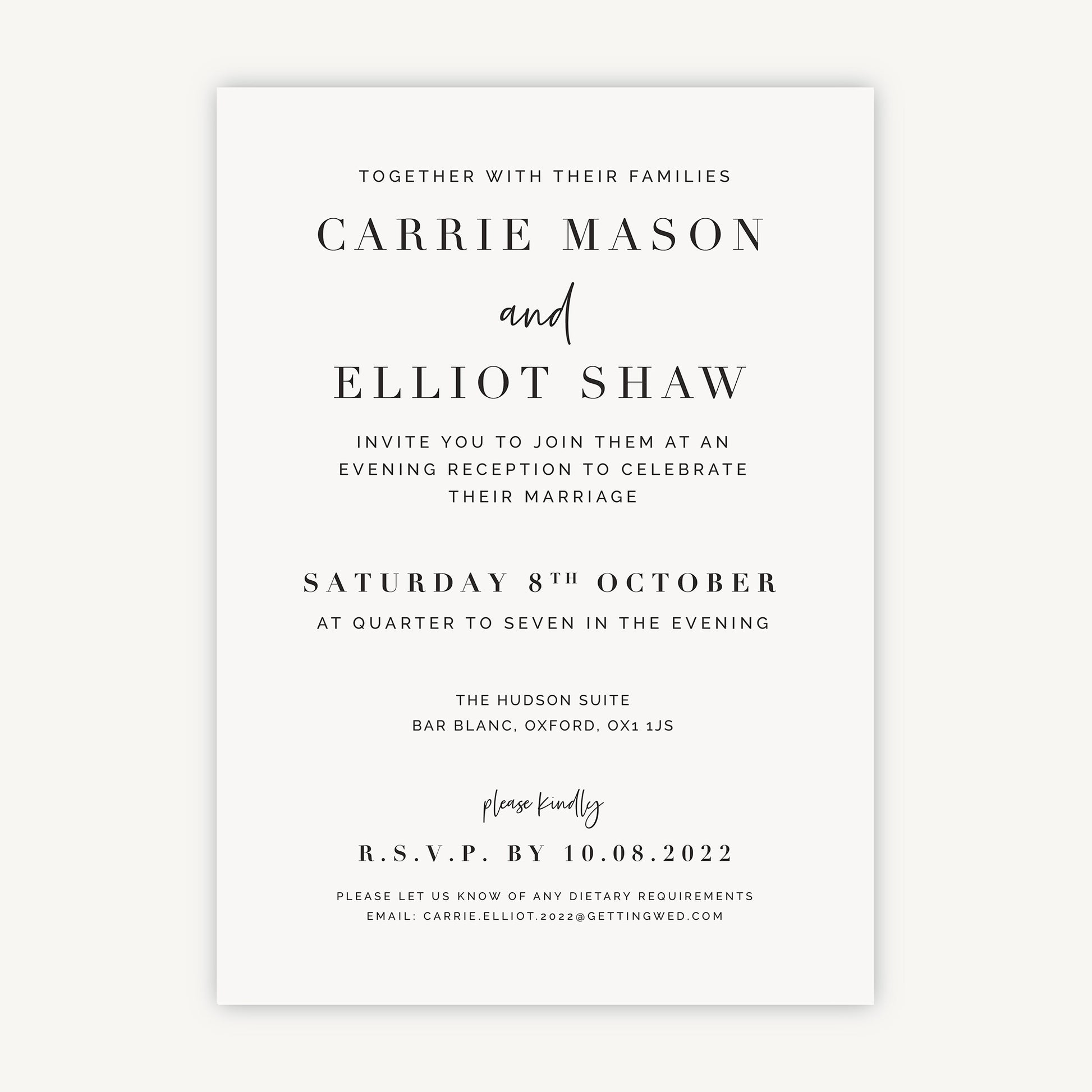 Set the tone for your wedding celebrations with our sleek White Modern Script Evening Wedding Invitation. Clean spacing and monochrome visuals give this design a luxuriously modern quality. The unique composition allows for a curated welcome message and the evening's important details alongside your RSVP date and contact information.