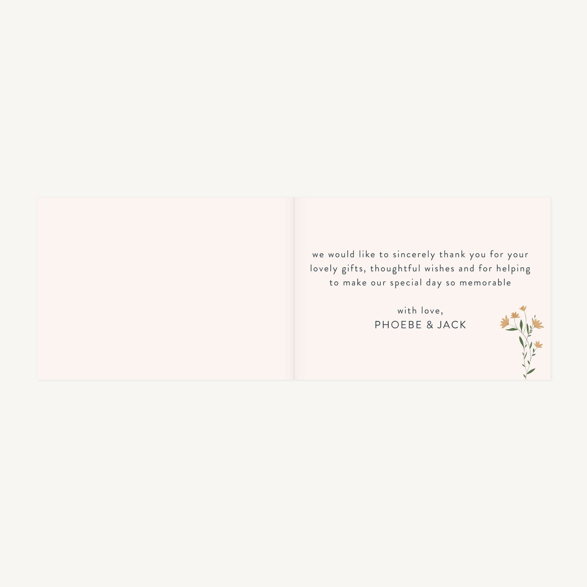 Spread a little of the love you felt on your special day with our Wildflower Wreath Wedding Thank You Card Folded. This beautiful collection features wreaths of intricate wildflower illustrations atop a soft peach coloured background. The stationery displays thanks alongside your wedded name and ceremony date, then the card opens to a gracious message inside.