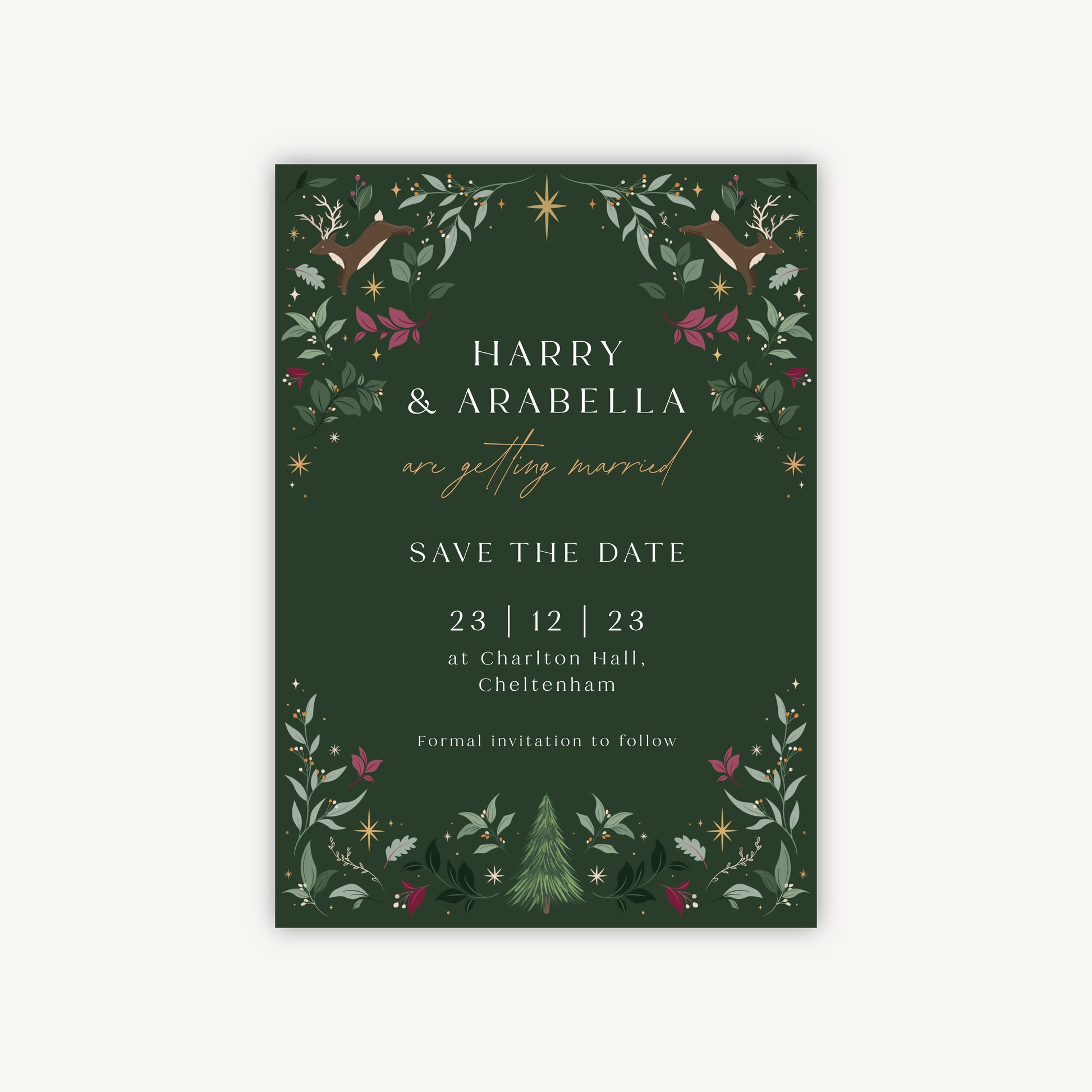 Give your guests a taste of your festive celebrations with our Winter Christmas Wedding Save the Date. This cosy design features symmetrical arrangements of winter foliage, berries, and twinkling stars on a rich green background. Add your initials in the centre of the leafy arrangement and your wedding details displayed in co-ordination below.