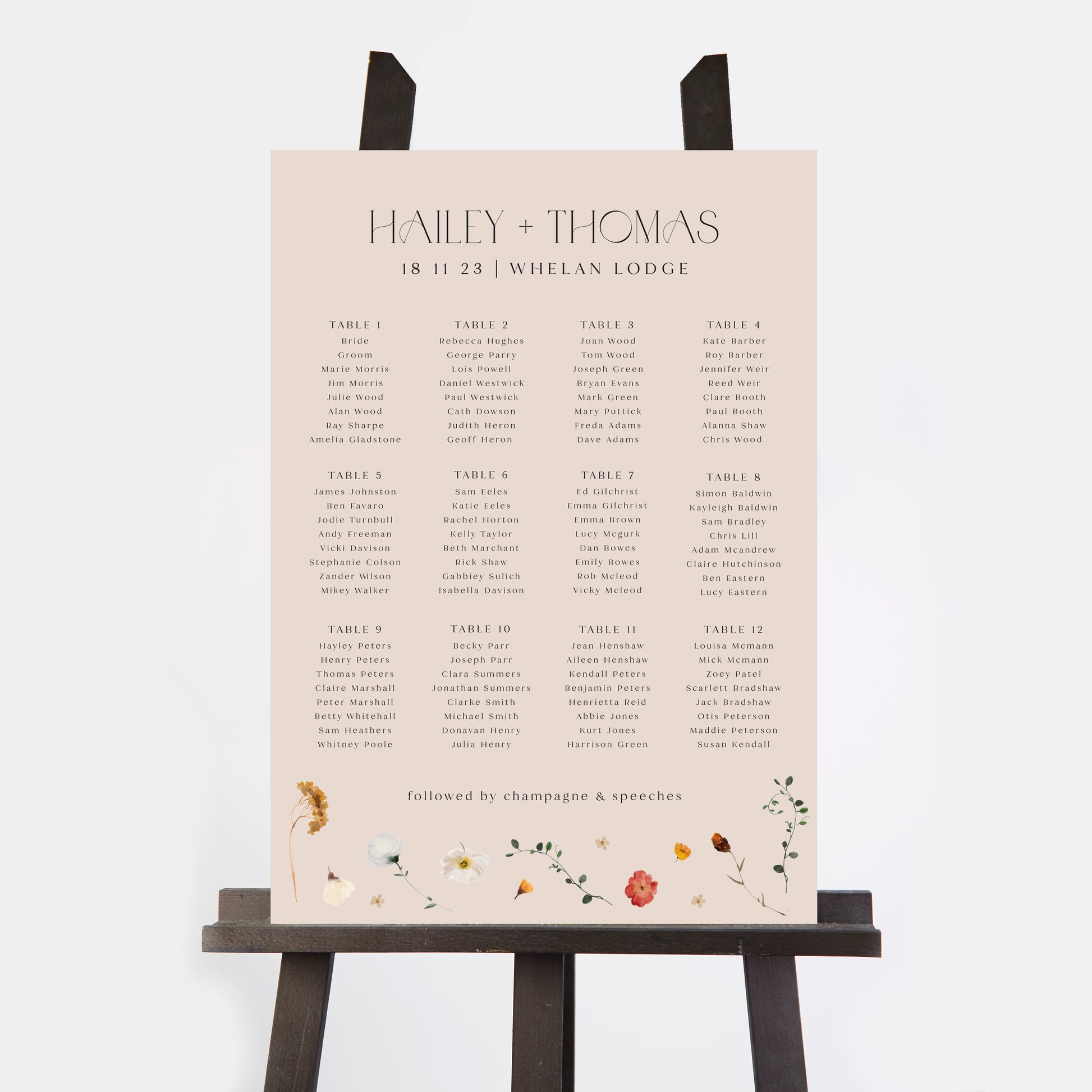 Our Winter Floral Wedding Table Plan beautifully presents the seating arrangements of your beloved guests on a subtle stone background. The illustration features an array of delicate seasonal botanicals with twisting vines and greenery throughout. Leading with the couple’s names, the elegant board presents your customised listing of tables and the names of each guest seated there.